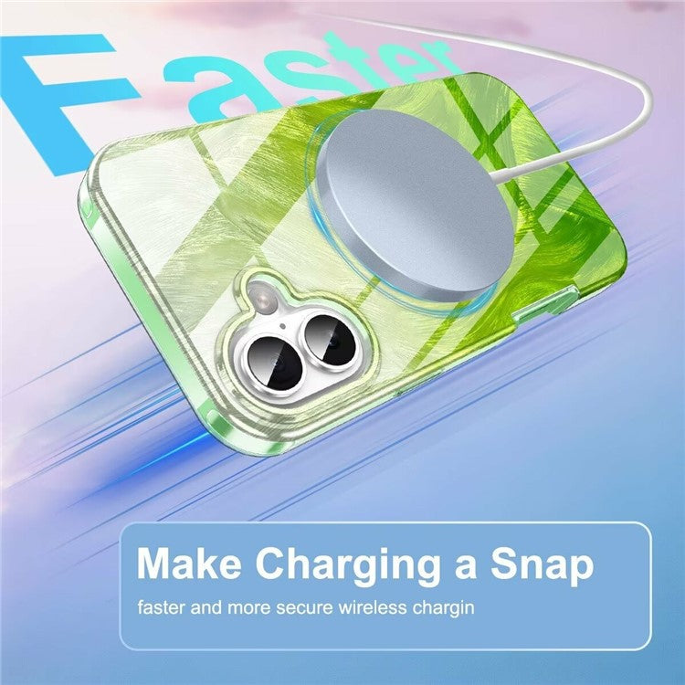 For iPhone 16 Case Gradient Feather Pattern PC+TPU Phone Cover Built-In PET Screen Film - Green