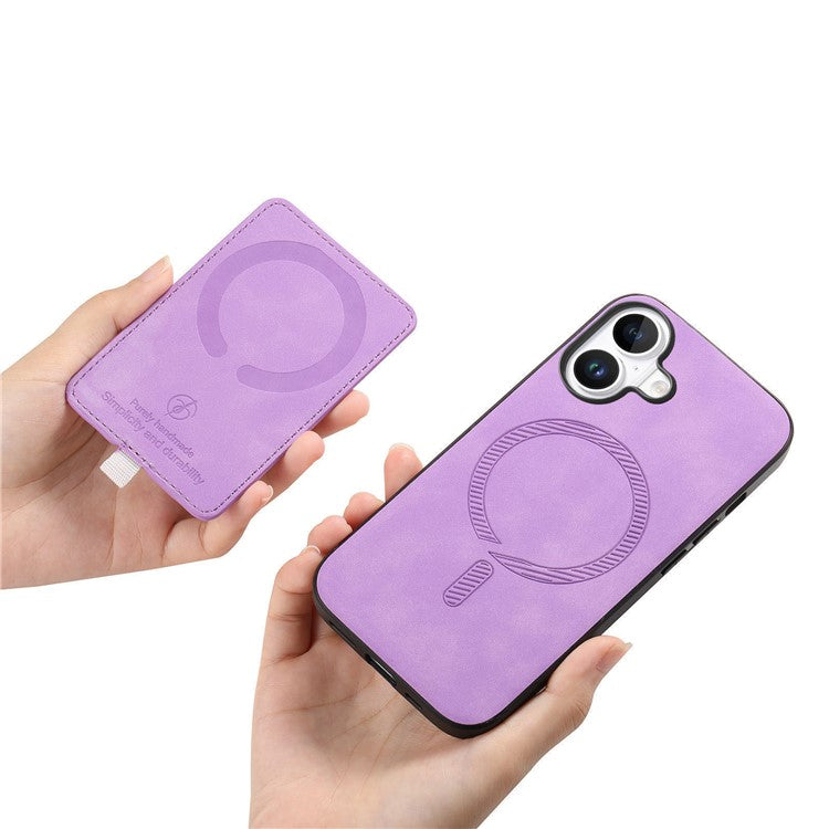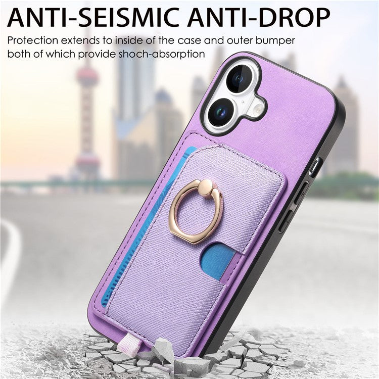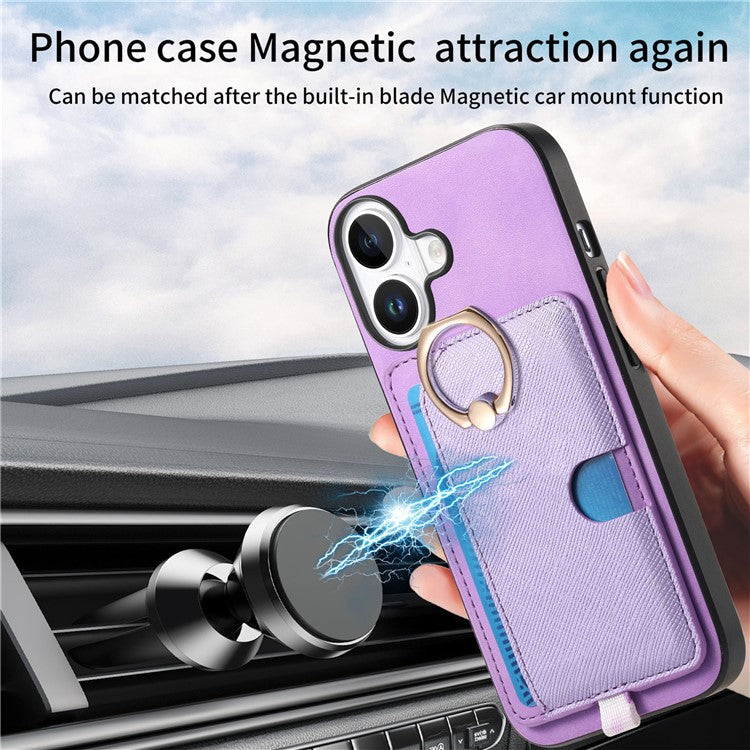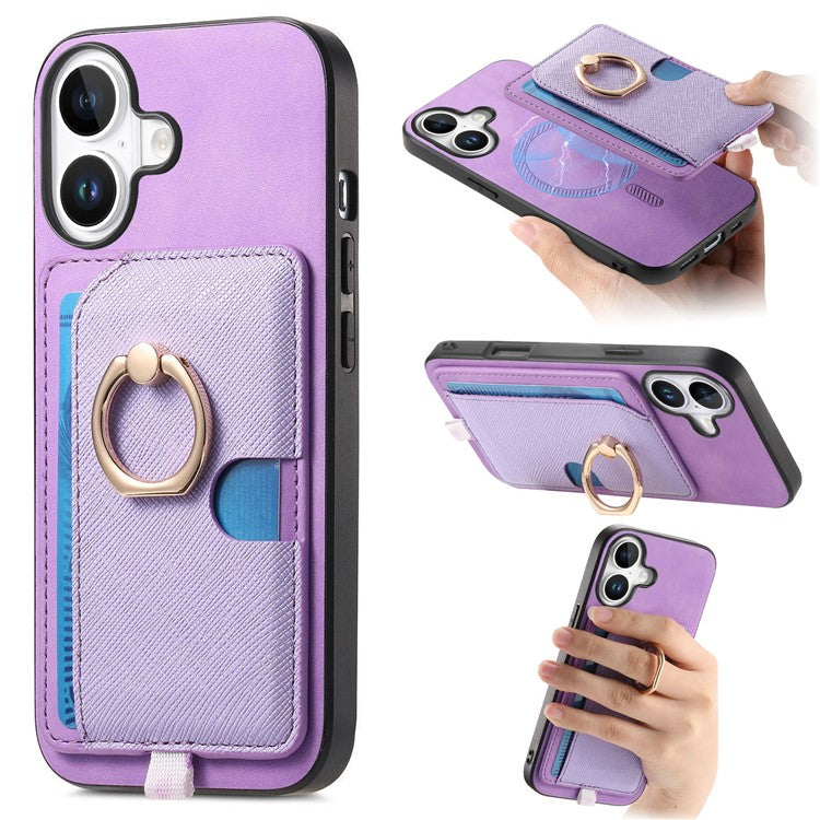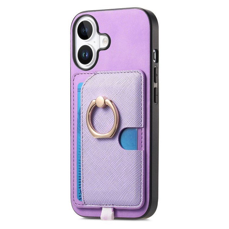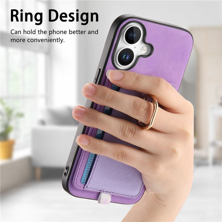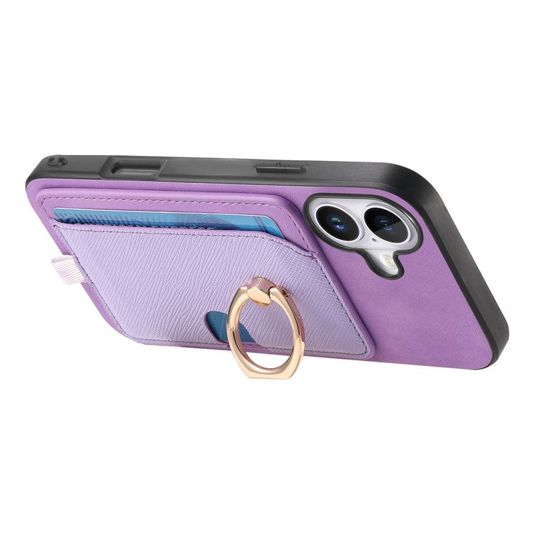 For iPhone 16 Case Ring Kickstand Leather+TPU+PC Phone Cover Detachable 2-in-1 Card Holder - Purple