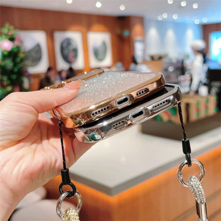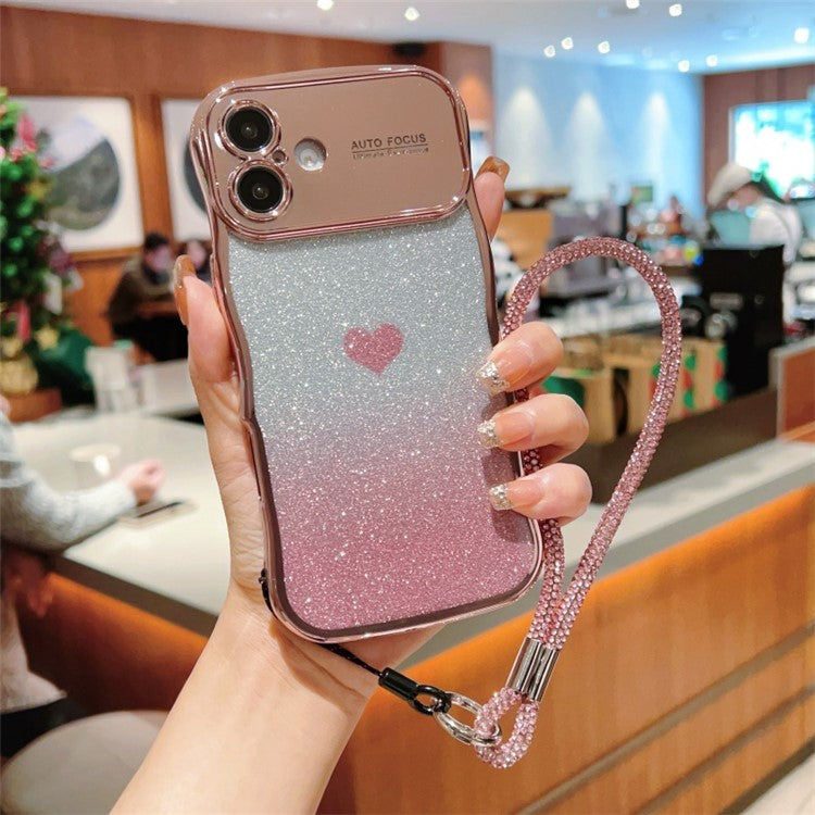 For iPhone 16 Case with Strap Electroplating TPU Phone Cover Love Heart Gradient Glitter - Rose Pink