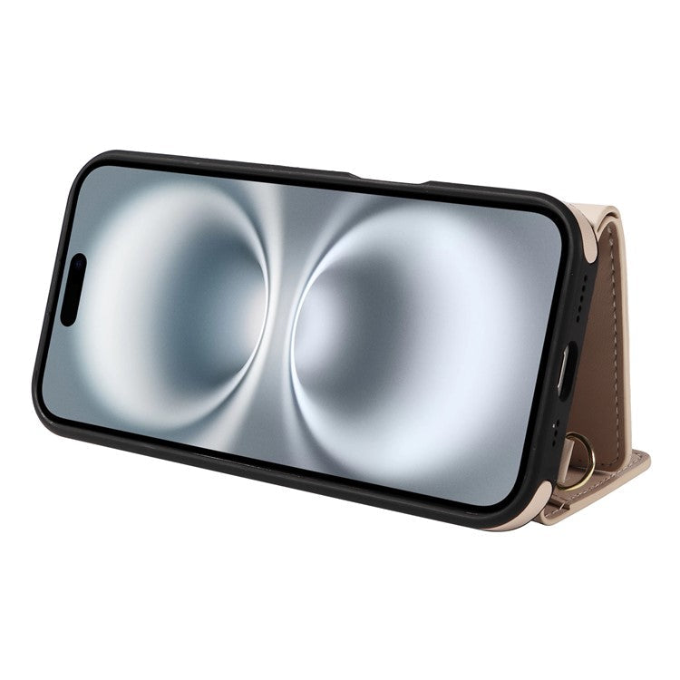 For iPhone 16 Crossbody Phone Case Card Holder Kickstand Leather Coated TPU Mobile Cover - Beige