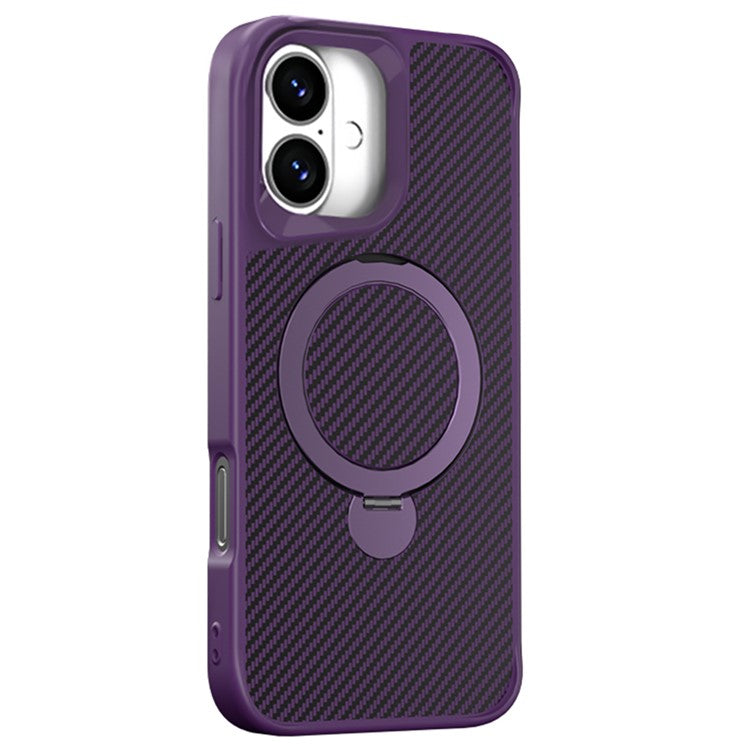 For iPhone 16 Phone Case with Magnetic Kickstand TPU + PC Carbon Fiber Back Cover - Purple
