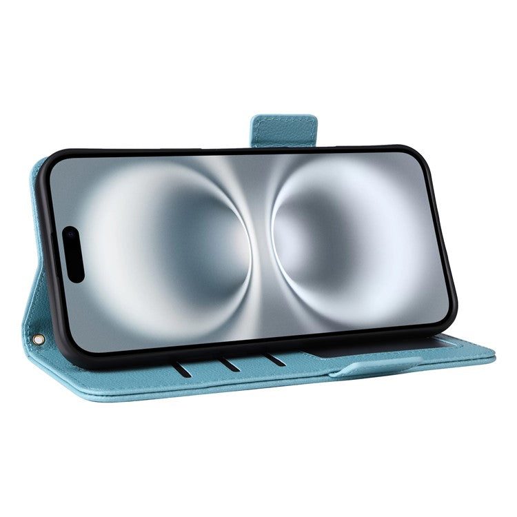 For iPhone 16 Plus Case Litchi Texture PU Leather Wallet Flip Phone Cover - Baby Blue
