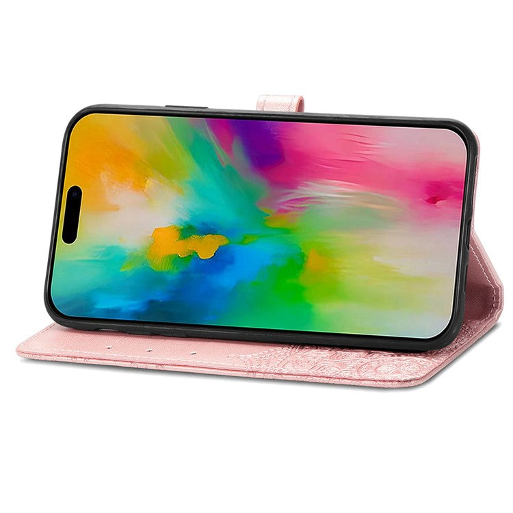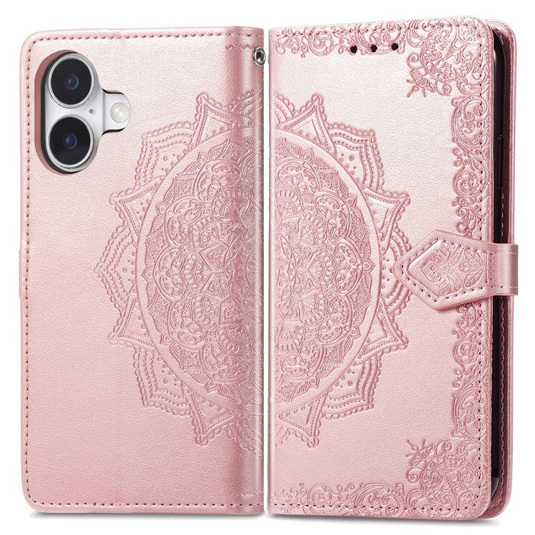 For iPhone 16 Plus Case Mandala Embossed Design Leather Wallet Phone Cover - Rose Gold