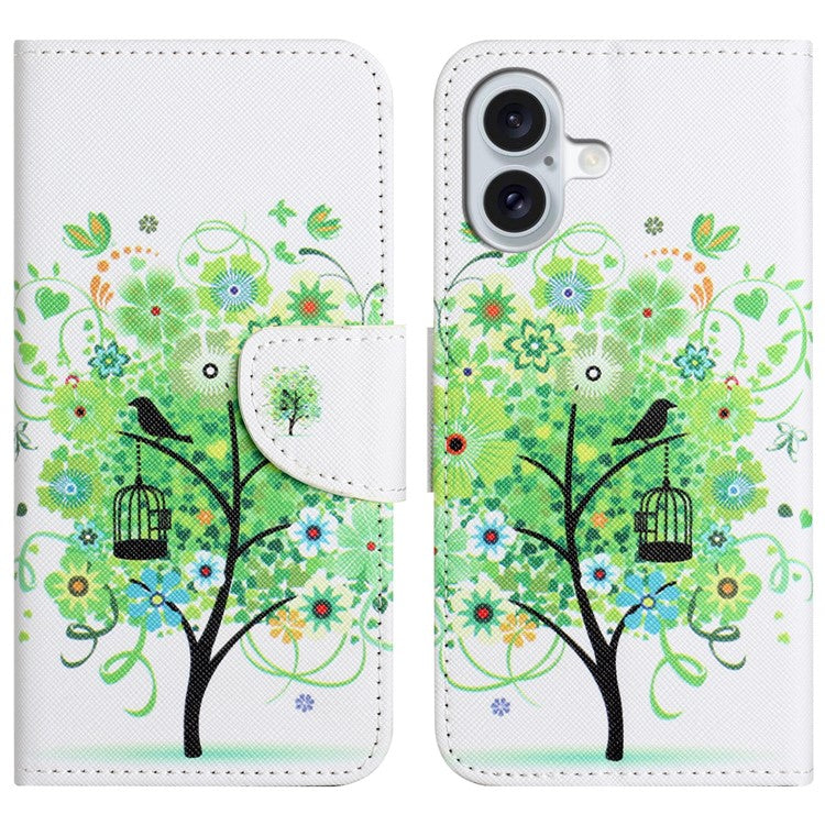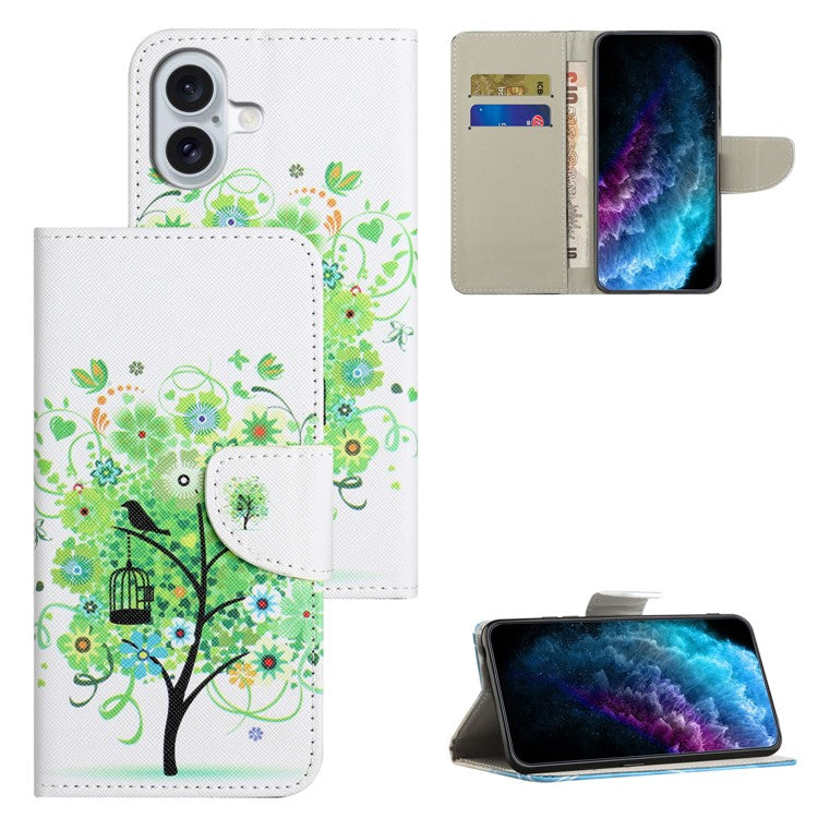 For iPhone 16 Plus Case Pattern Printing Cross Texture Phone Leather Cover - Green Tree