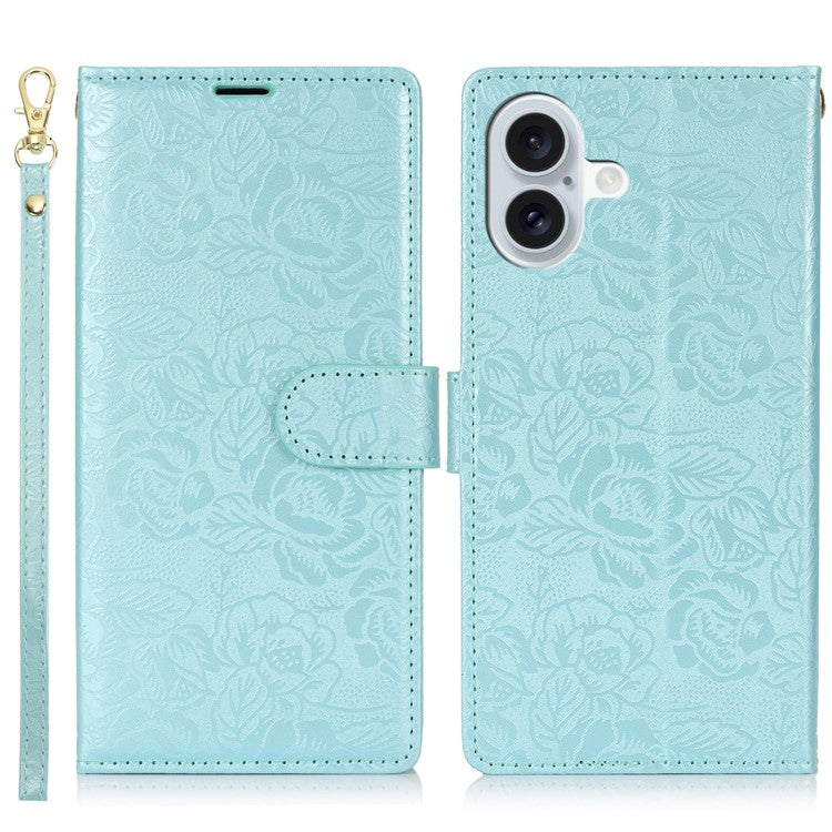 For iPhone 16 Plus Case with Hand Strap Flower Imprint Leather Wallet Phone Cover - Blue