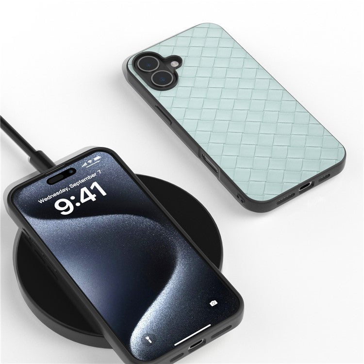 For iPhone 16 Plus Case Woven Texture Leather+PC+TPU Hybrid Phone Cover - Light Green