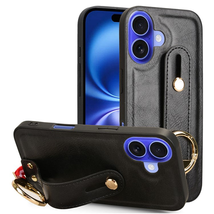 For iPhone 16 Plus Case Wristband Kickstand Leather+PC+TPU Phone Cover with Bottle Opener - Black
