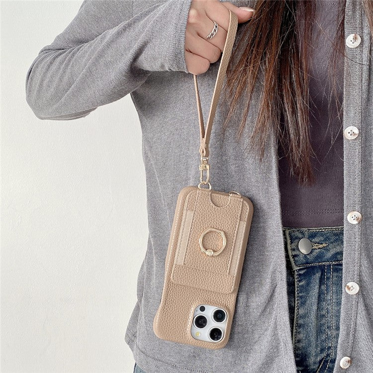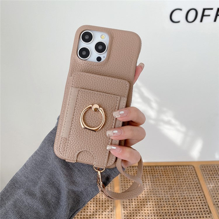 For iPhone 16 Pro Case Card Slots Kickstand PU Leather Back Cover with Ring Holder, Wrist Strap - Light Brown