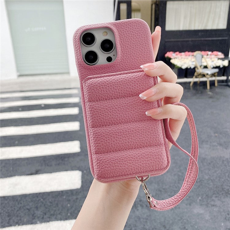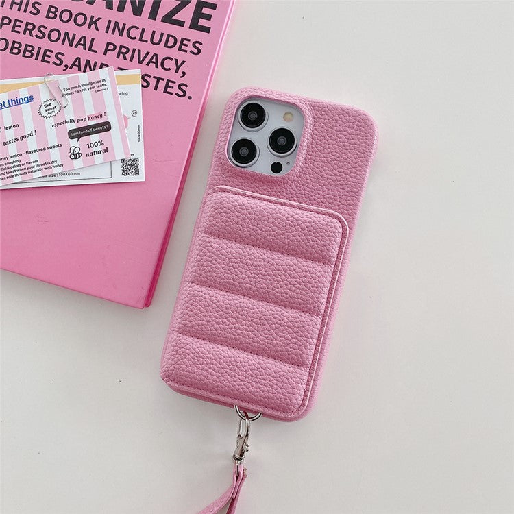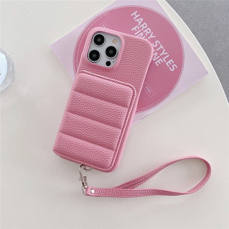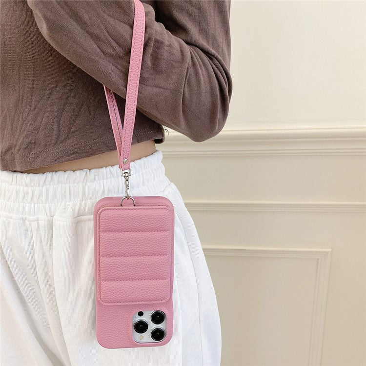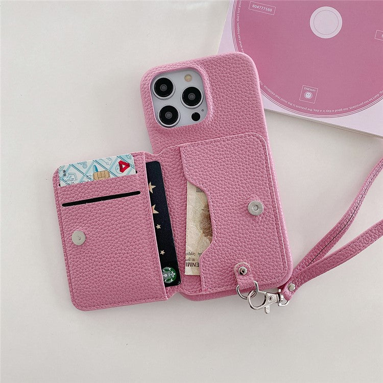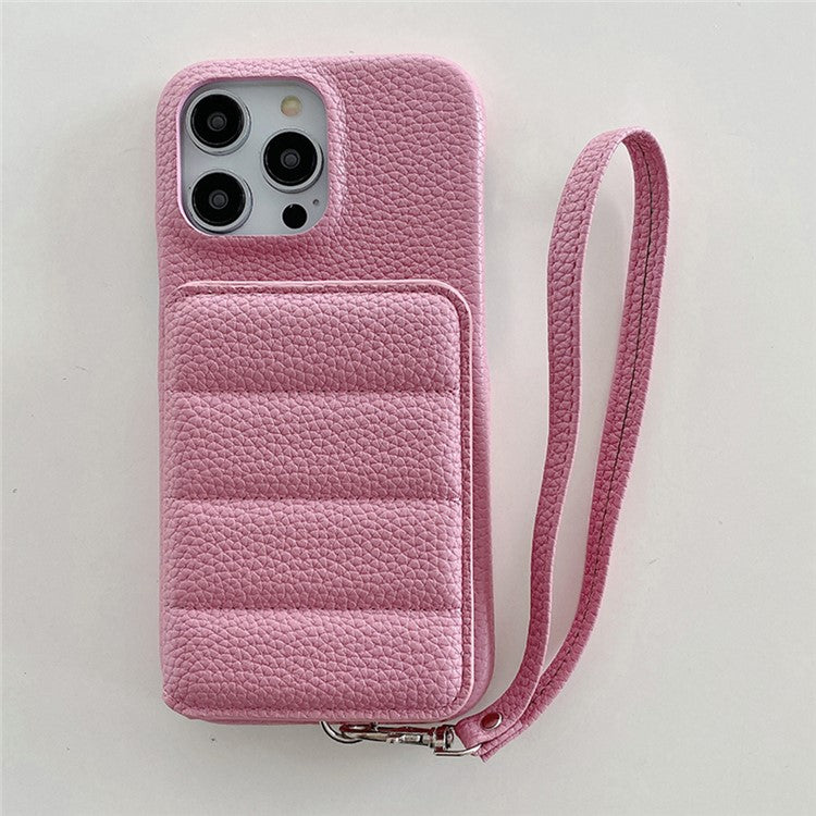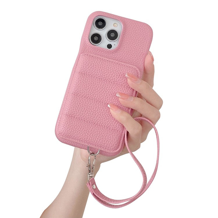 For iPhone 16 Pro Case Card Slots Kickstand PU Leather + PET Phone Cover with Wrist Strap - Pink