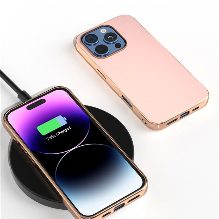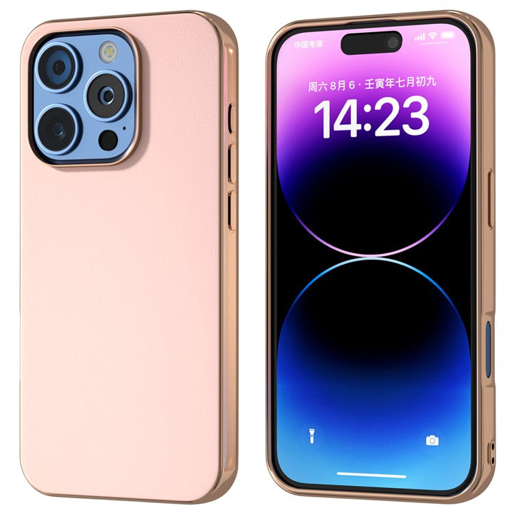 For iPhone 16 Pro Case Electroplating Edge PU Leather Coated TPU+PC Phone Cover - Light Pink
