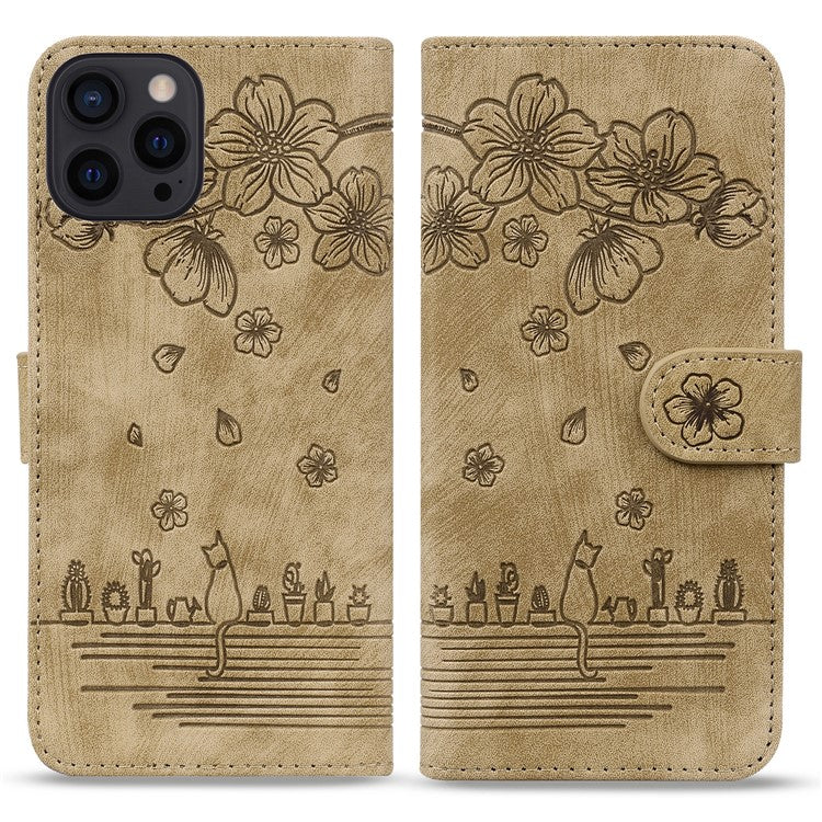 For iPhone 16 Pro Case Flower Cat Pattern Wallet Flip Leather Phone Cover - Brown