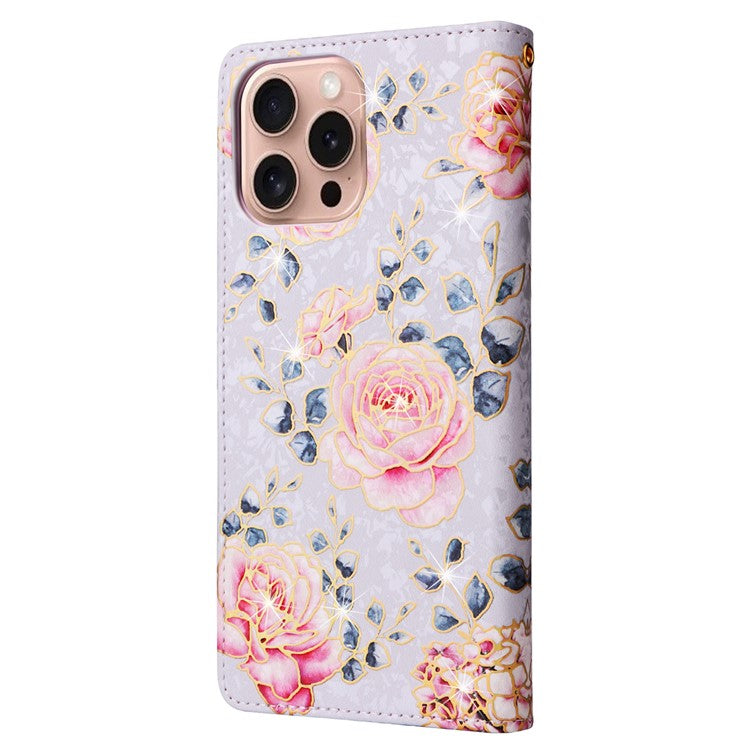 For iPhone 16 Pro Case Lacquered RFID Blocking Wallet PU Leather Stand Phone Cover - Rose Flower