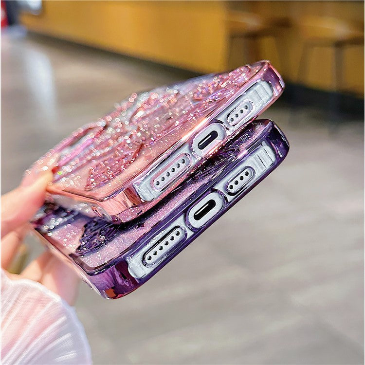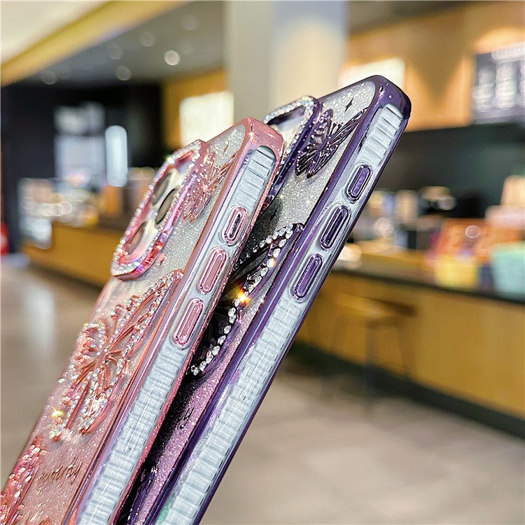 For iPhone 16 Pro Case Rhinestones Decor 3D Butterfly TPU Phone Cover with Glitter Paper - Black