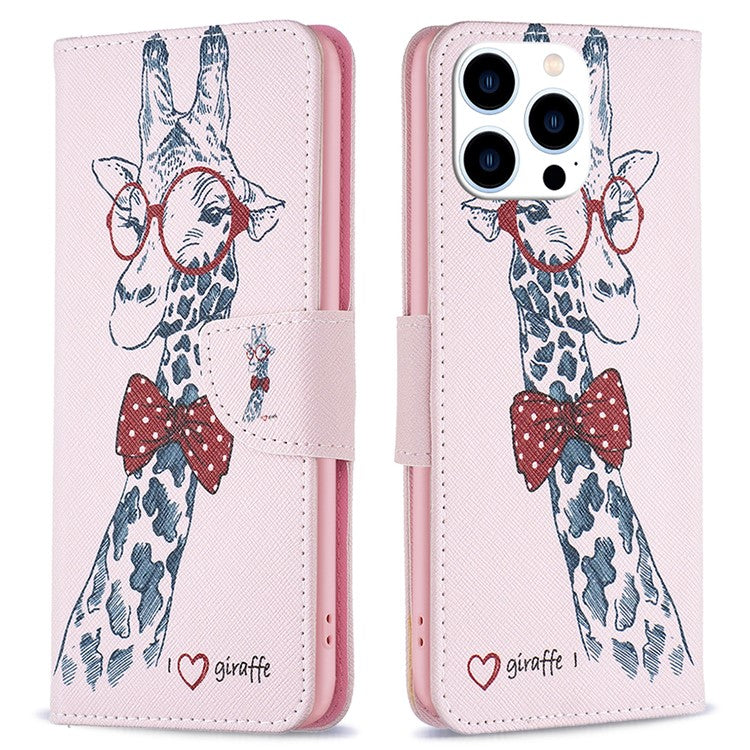 For iPhone 16 Pro Leather Case Pattern Printing Wallet Stand Phone Cover - Giraffe