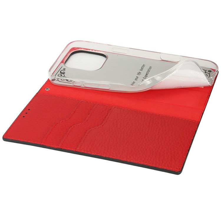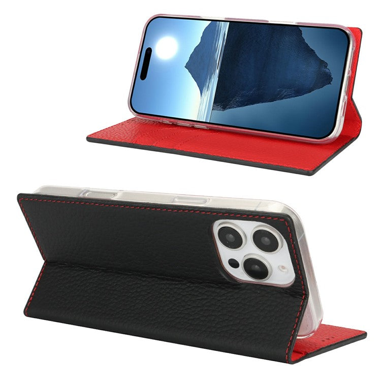 For iPhone 16 Pro Wallet Case Genuine Cow Leather Phone Cover Litchi Texture - Black