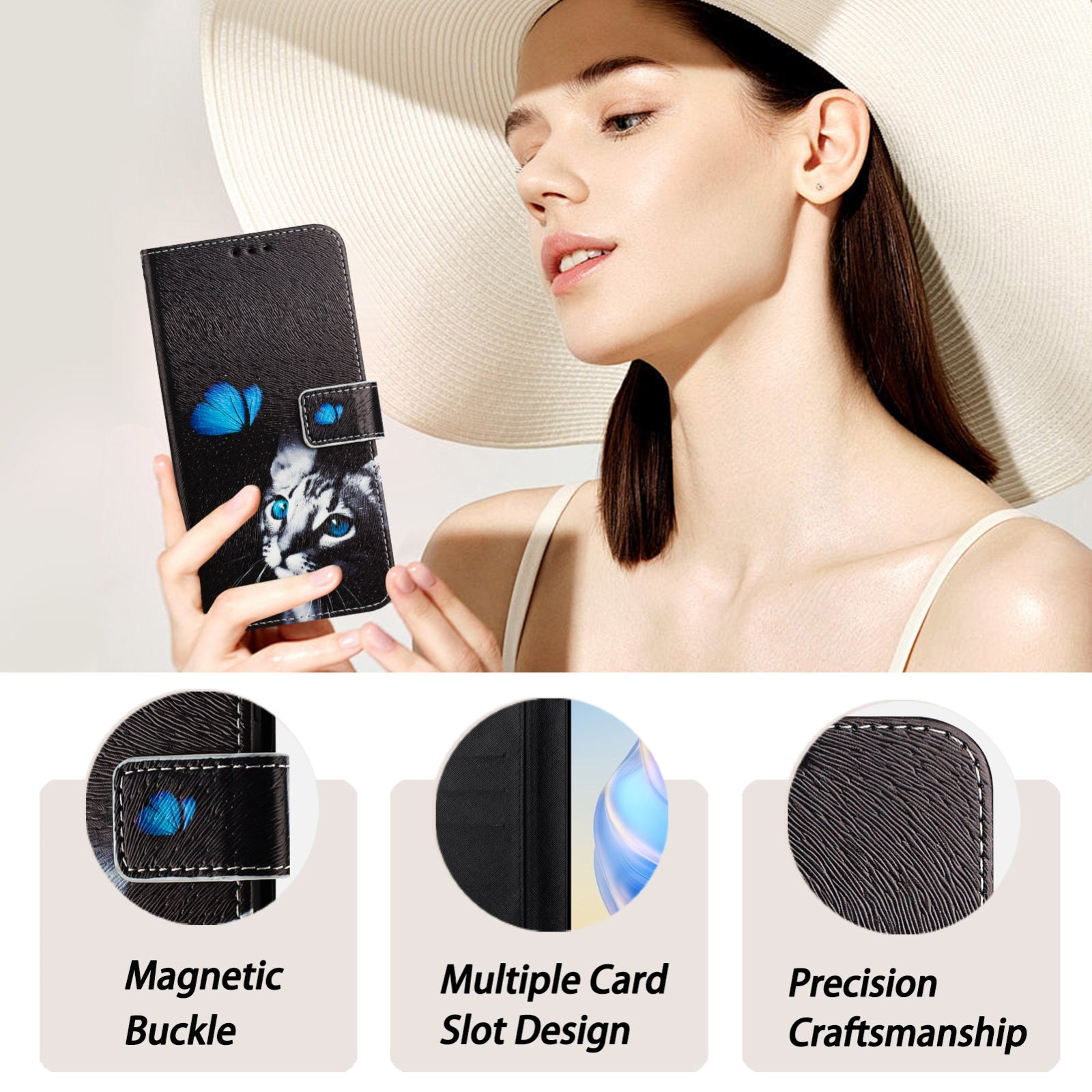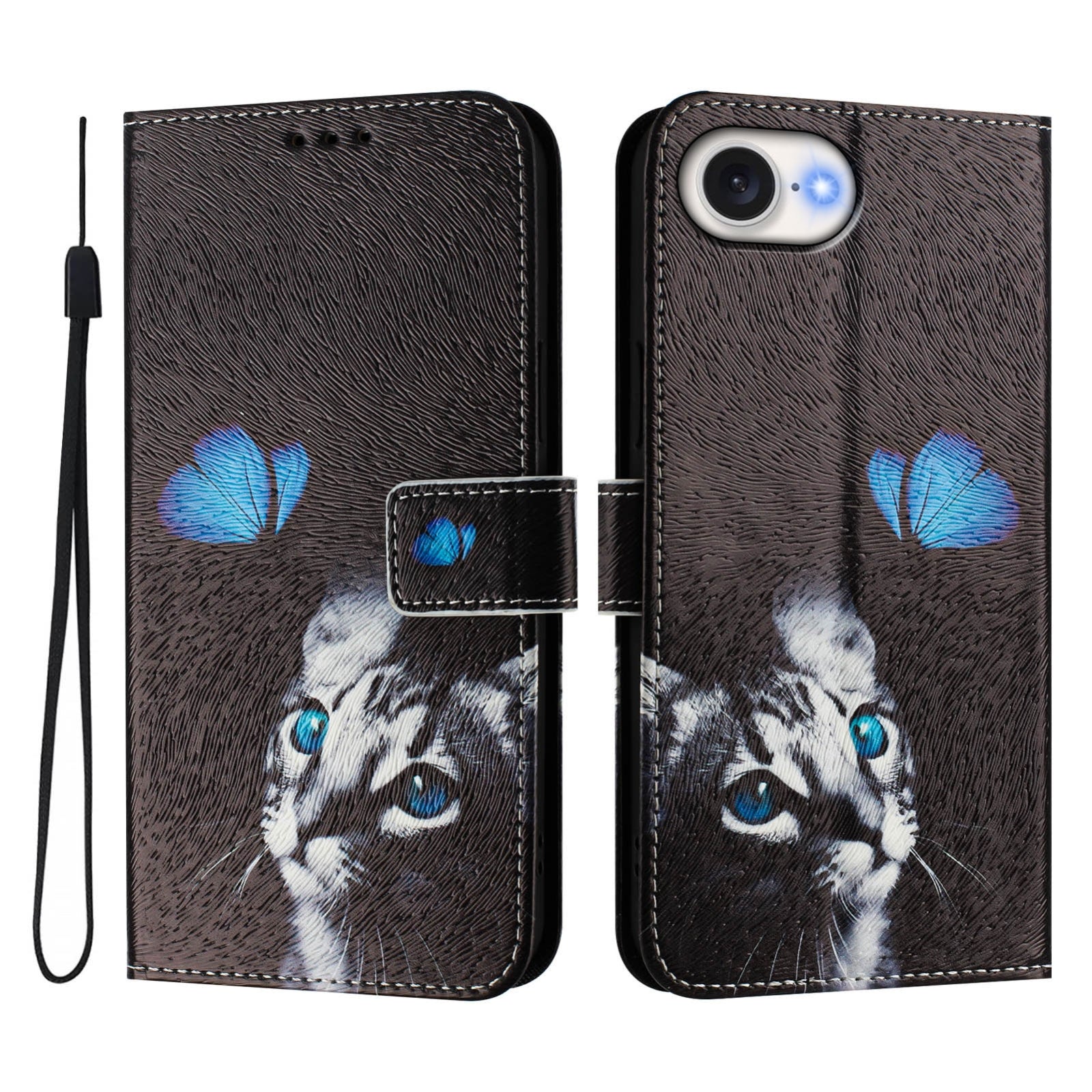 For iPhone 16e Art Colored Drawing Pattern Leather Phone Case(Butterfly cat)