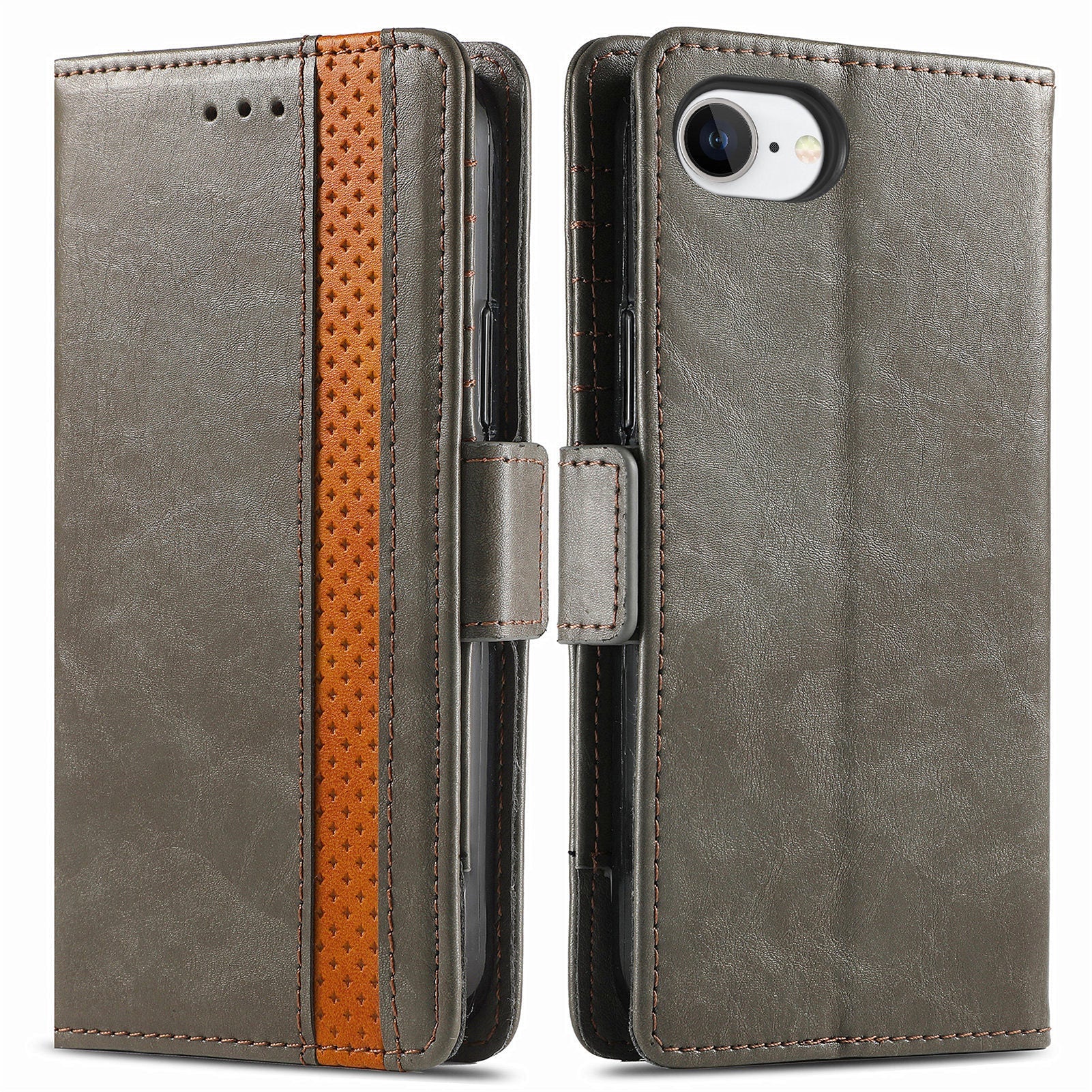 For iPhone 16e Case CASENEO 002 Series RFID Blocking Leather Wallet Stand Phone Cover - Grey