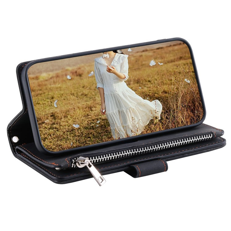 For iPhone 16e Case Rhombus Imprinted Zipper Wallet Leather Cover with Strap - Black