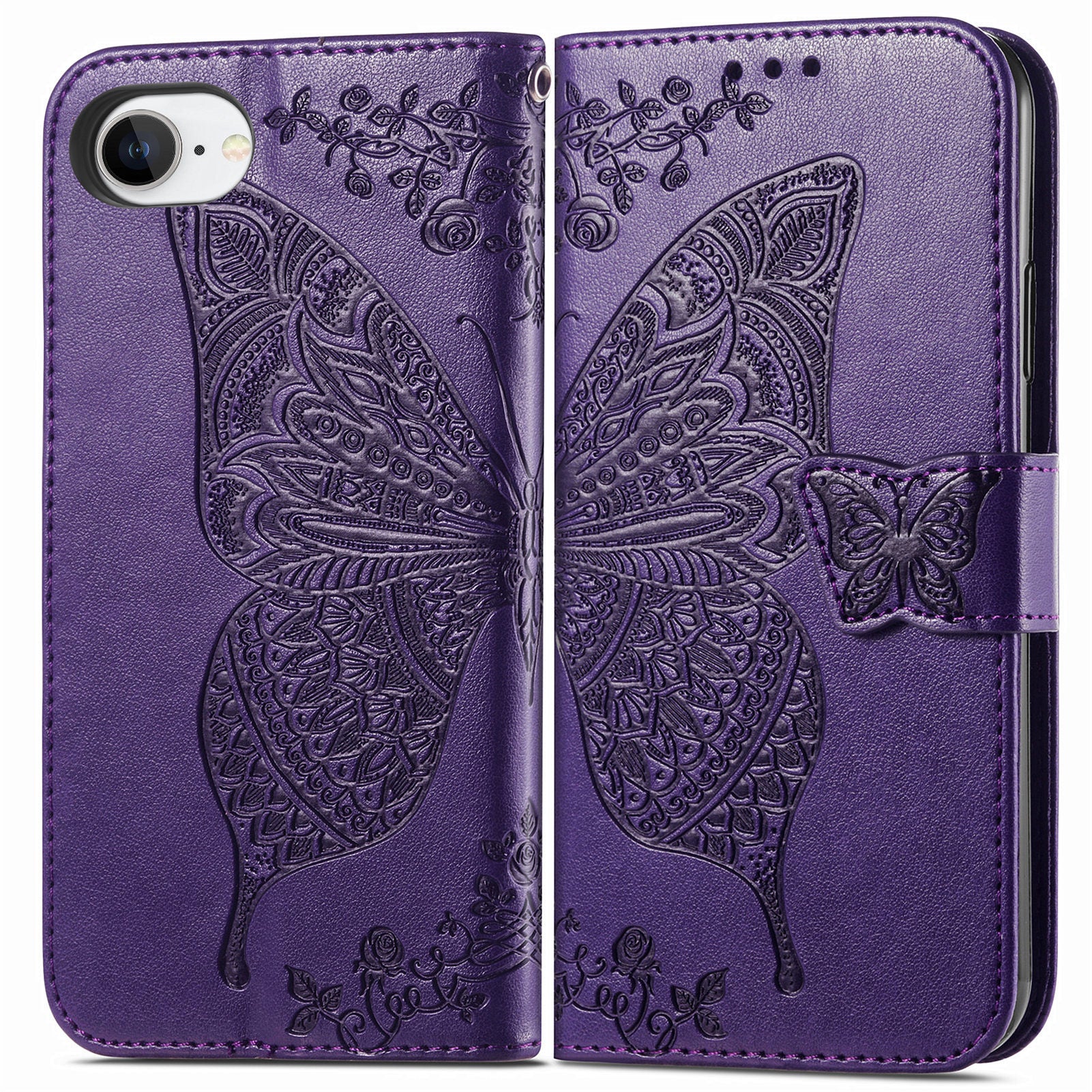 For iPhone 16e Case with Strap Butterfly Pattern PU Leather Wallet Phone Cover - Dark Purple