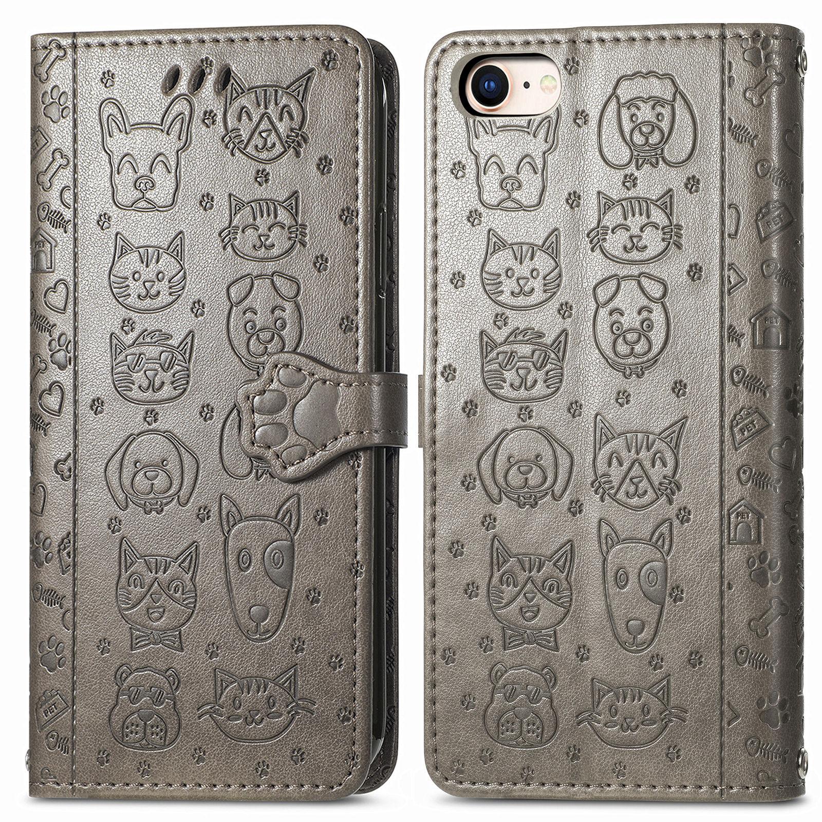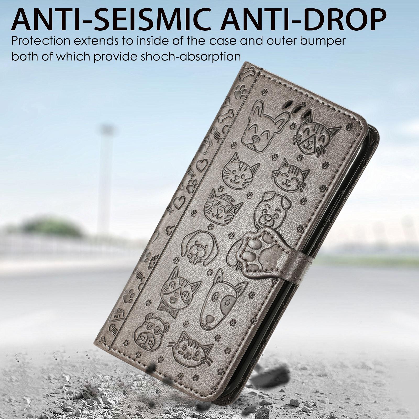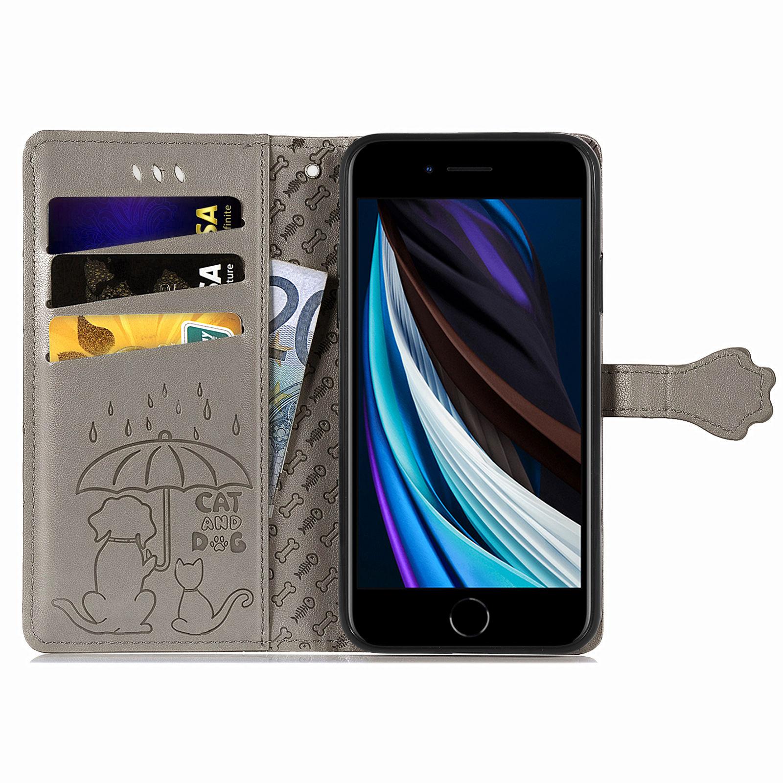 For iPhone 16e Cat and Dog Embossed Leather Phone Case(Gray)