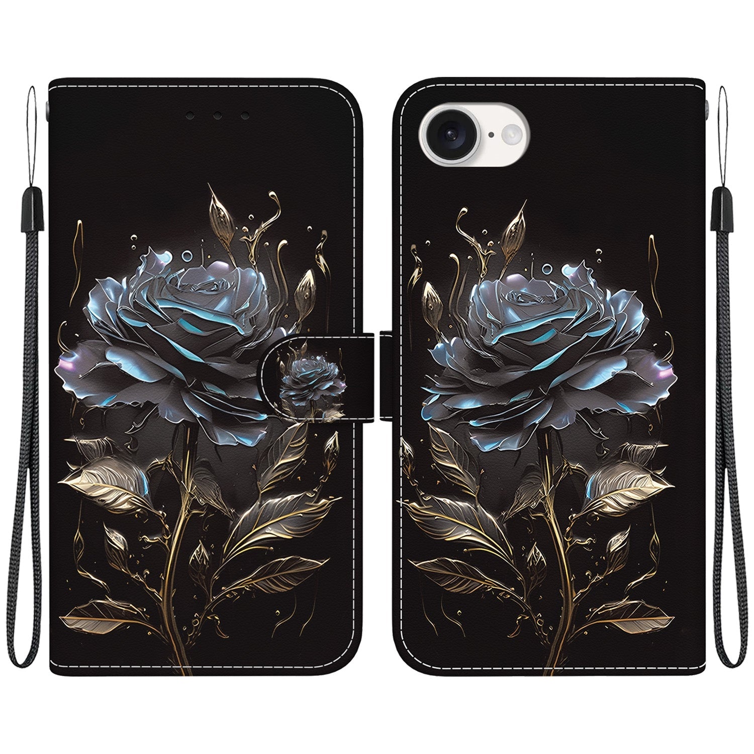 For iPhone 16e Crystal Texture Colored Drawing Leather Phone Case(Black Rose)
