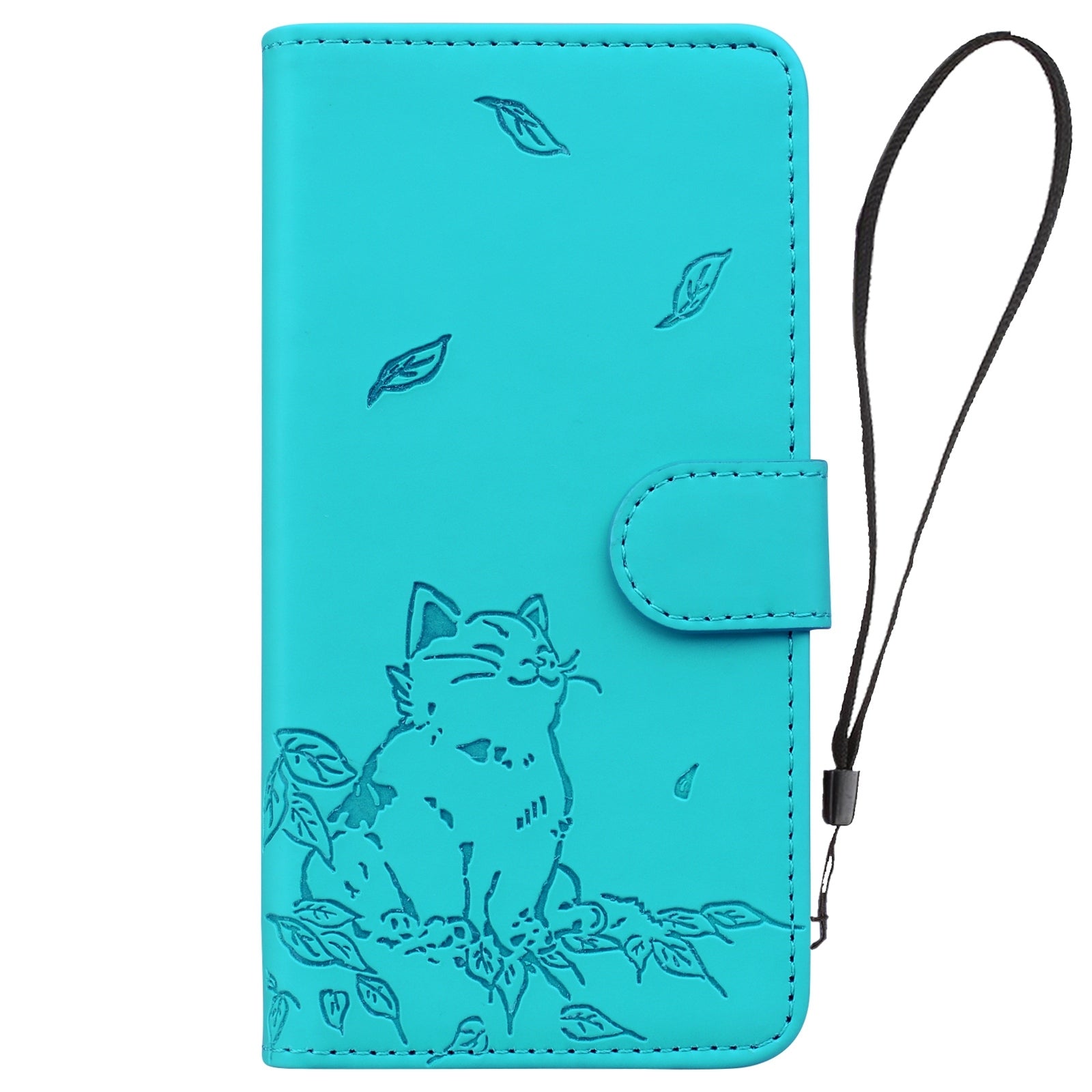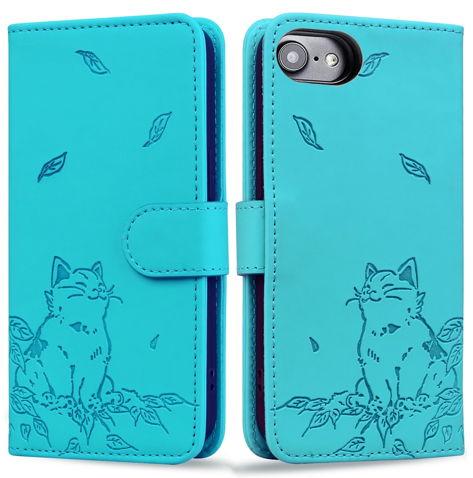 For iPhone 16e Cute Cat Embossed Leather Phone Case(Lake Blue)