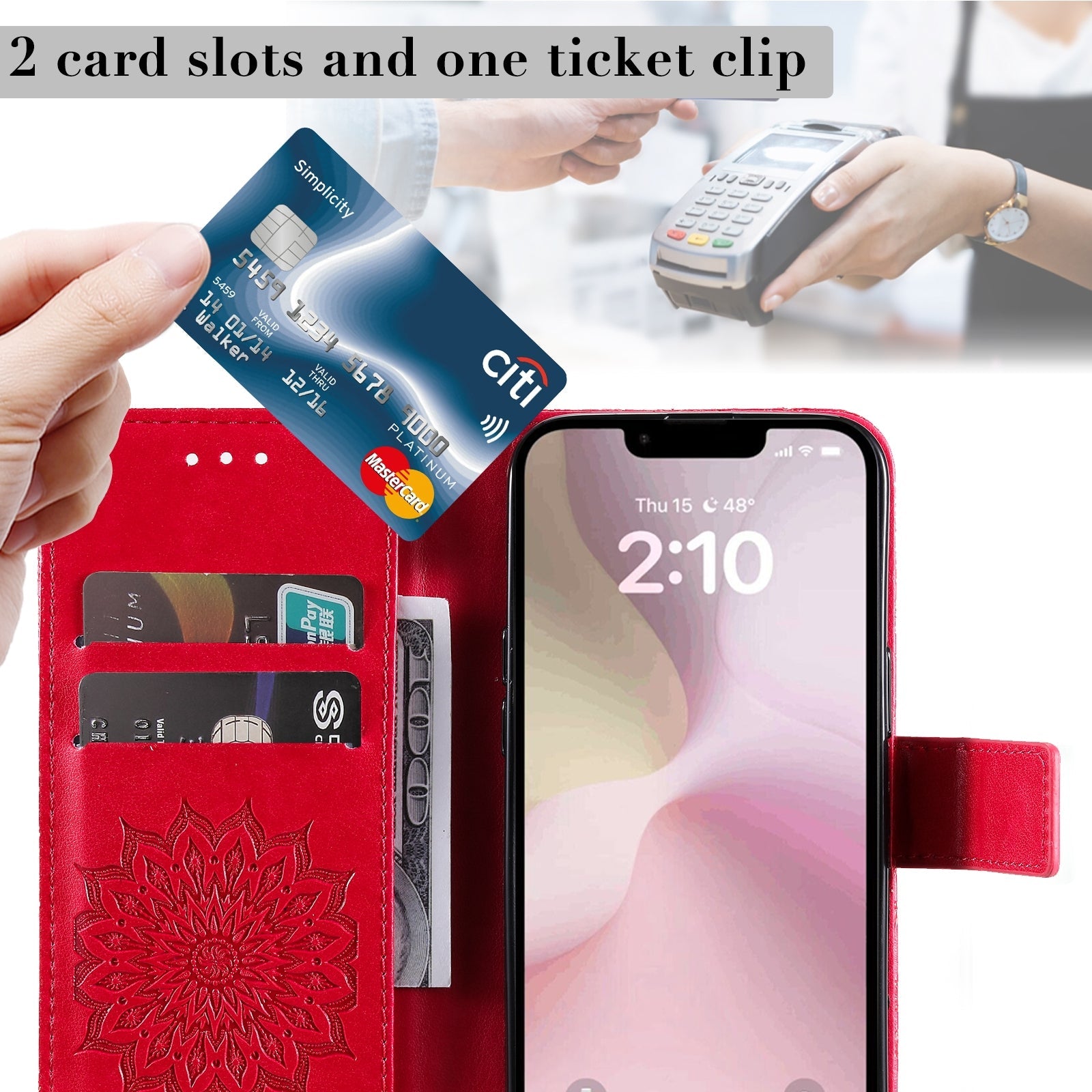 For iPhone 16e Embossed Sunflower Pattern Flip Leather Phone Case(Red)