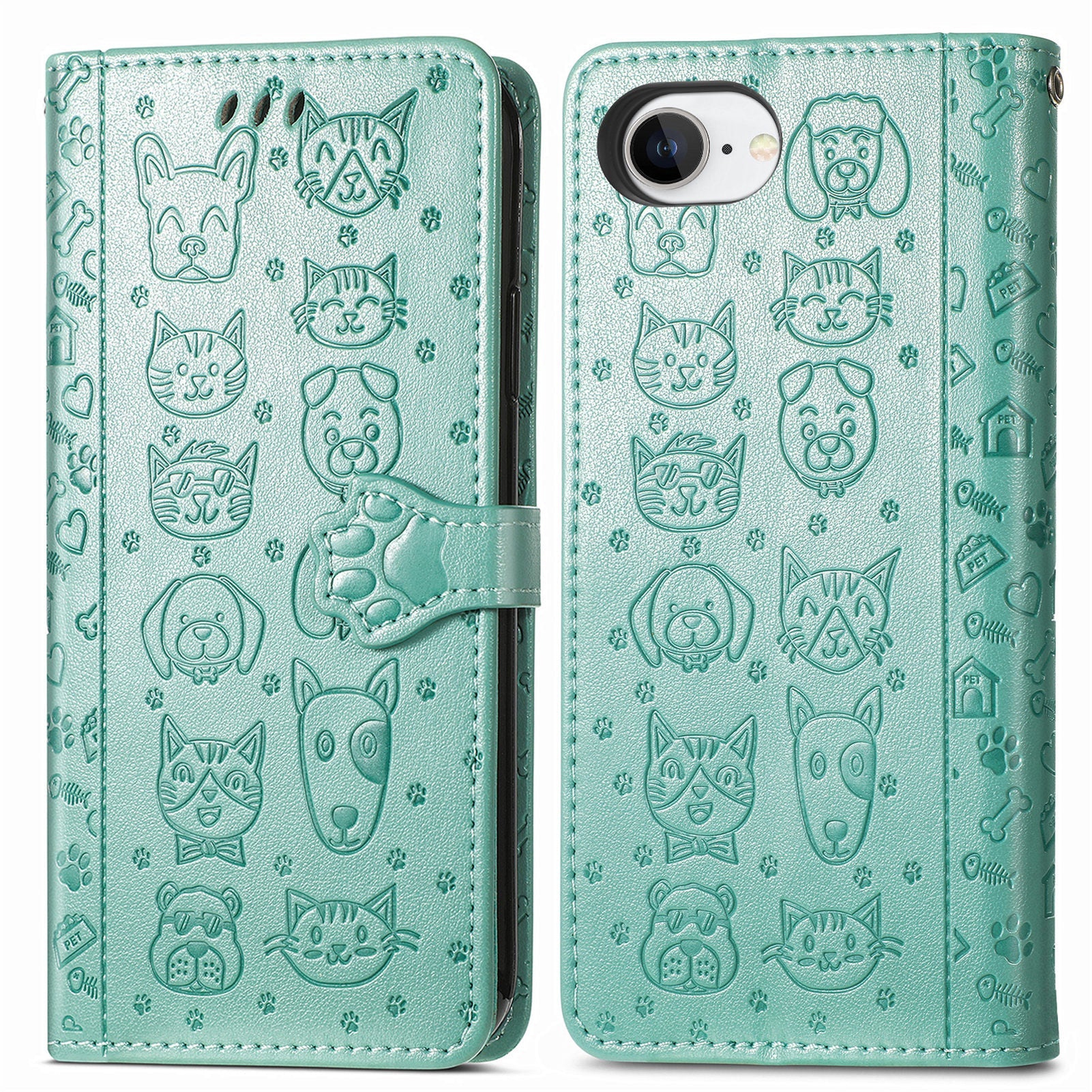For iPhone 16e Leather Wallet Case Flip Phone Cover with Cute Cat Dog Pattern - Green