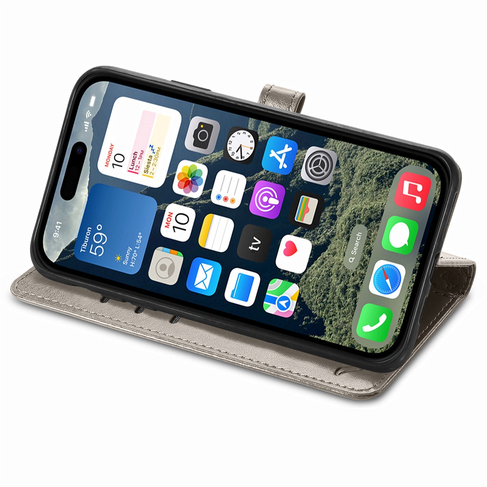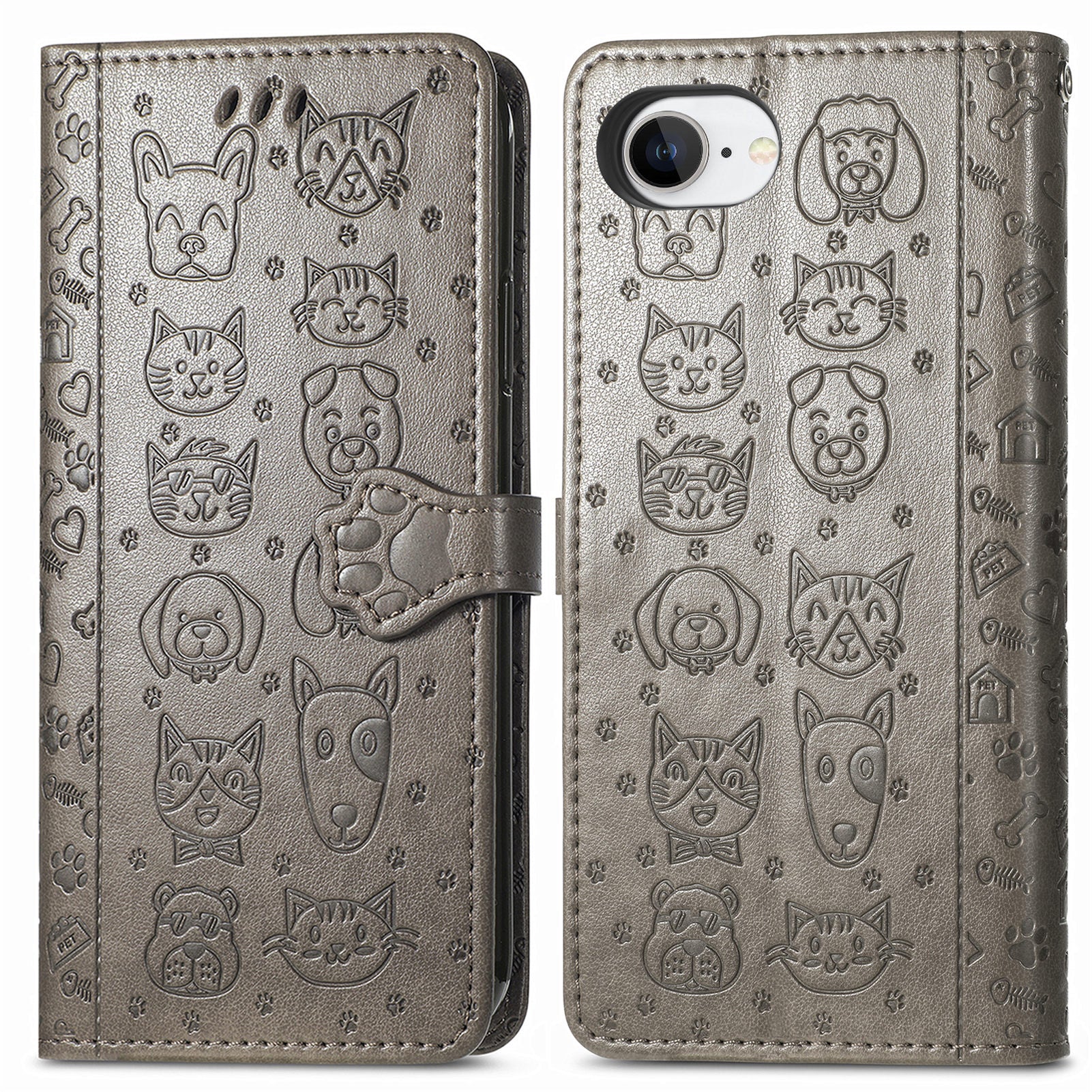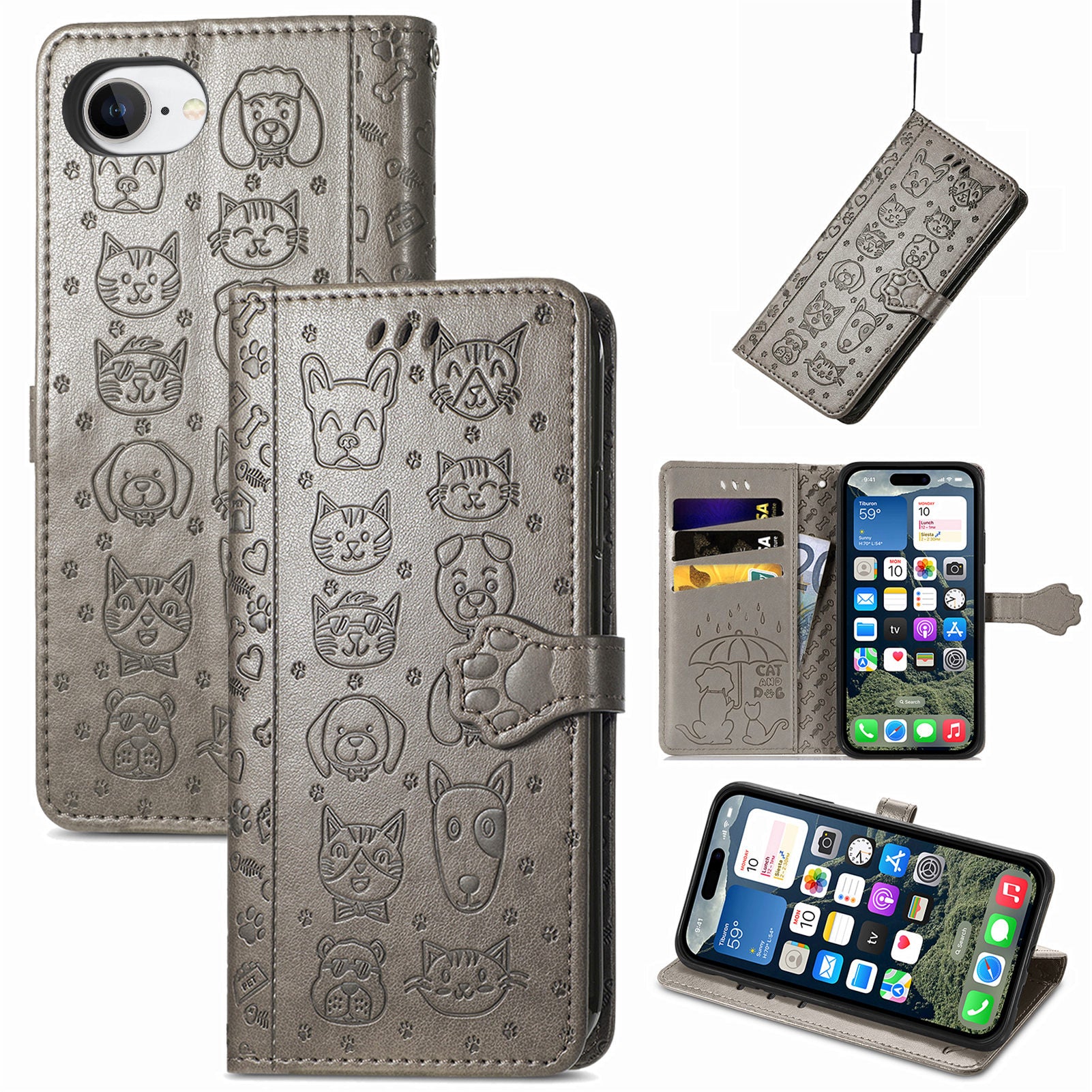 For iPhone 16e Leather Wallet Case Flip Phone Cover with Cute Cat Dog Pattern - Grey