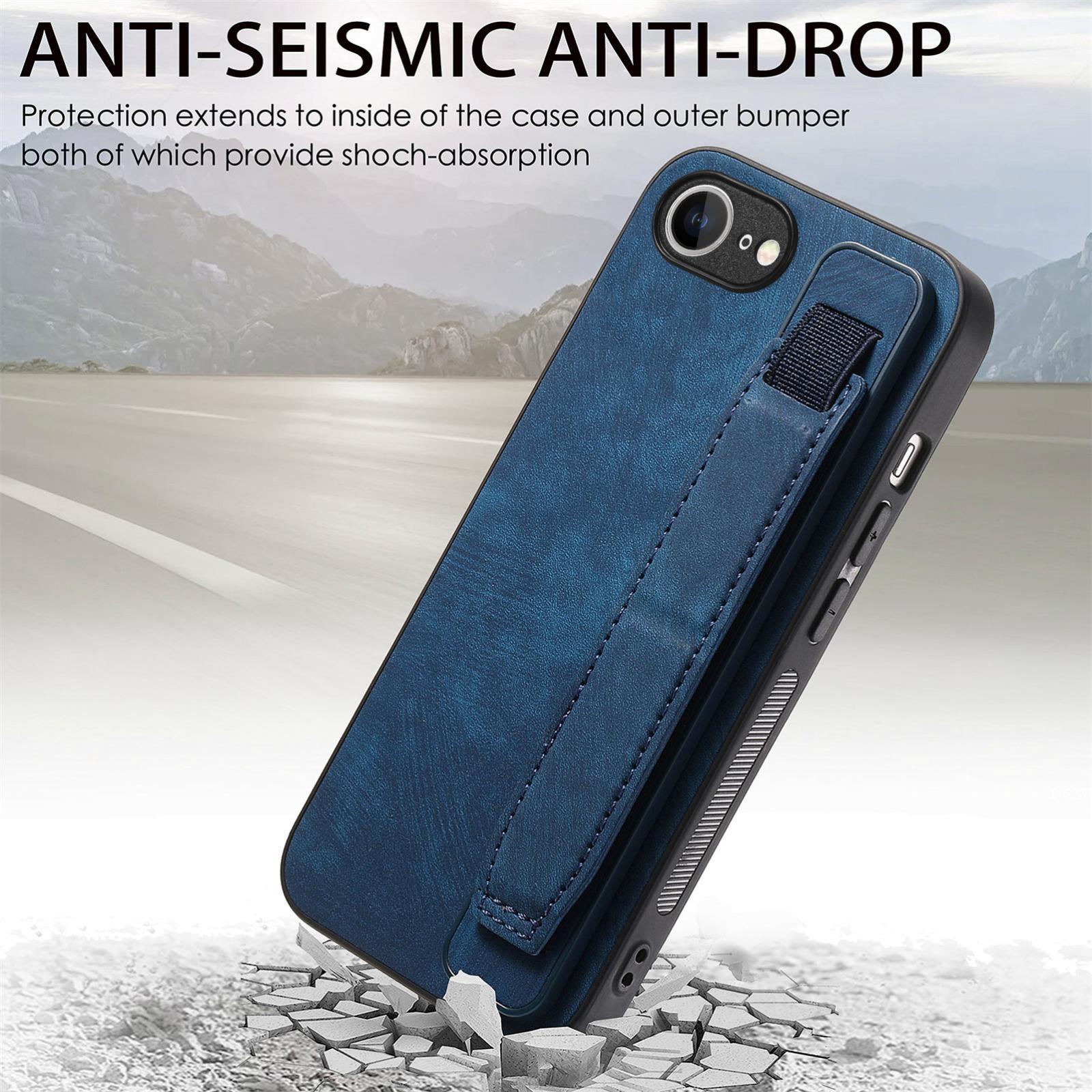 For iPhone 16e Retro Wristband Holder Leather Back Phone Case(Blue)