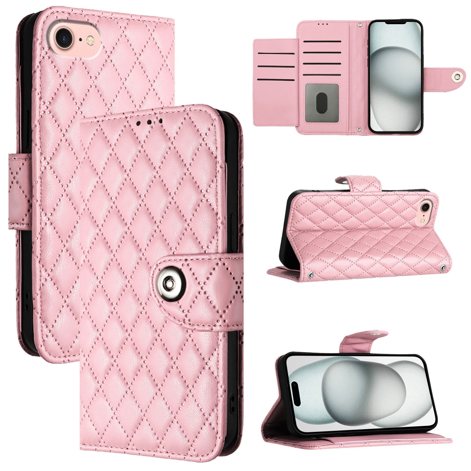 For iPhone 16e Rhombic Texture Flip Leather Phone Case with Lanyard(Pink)