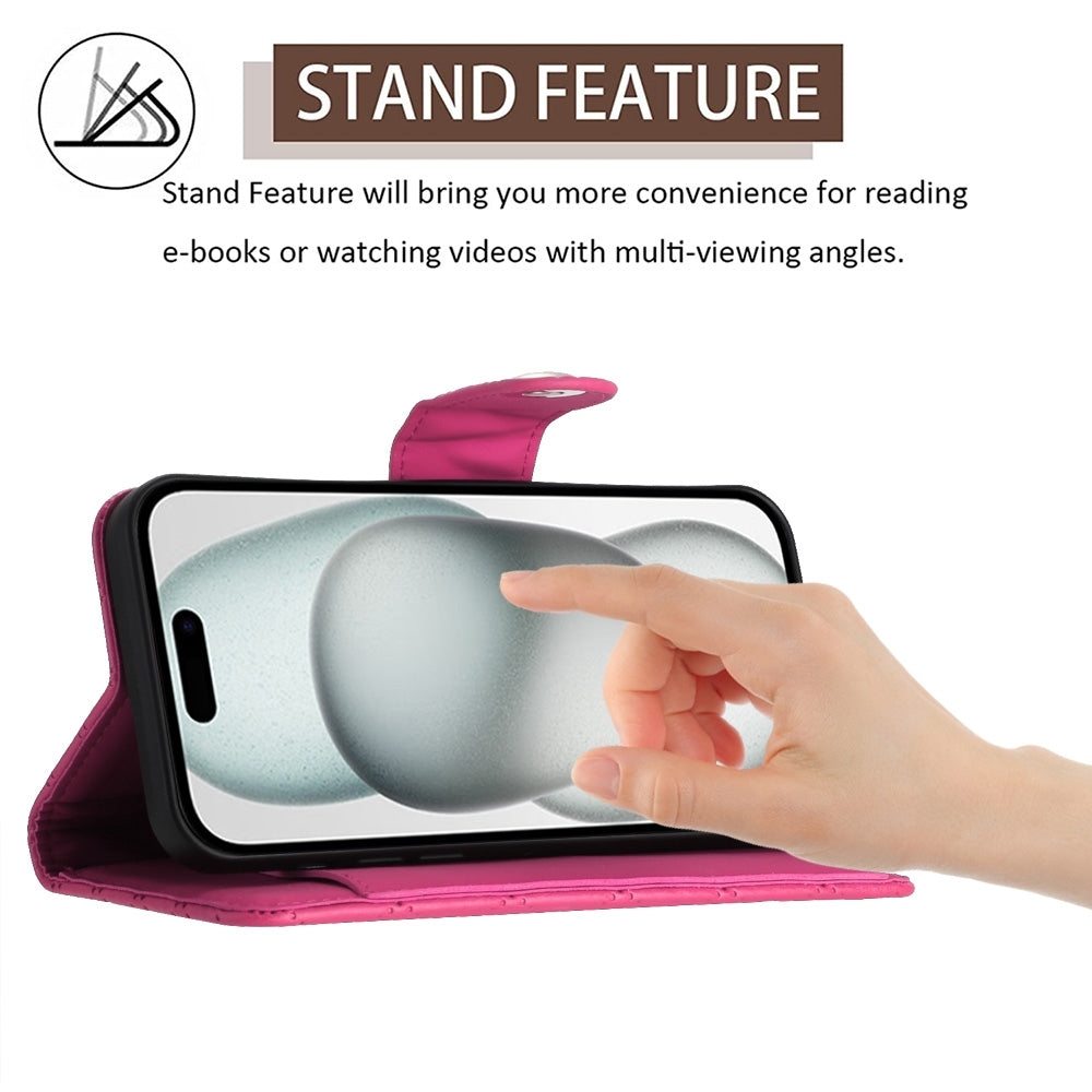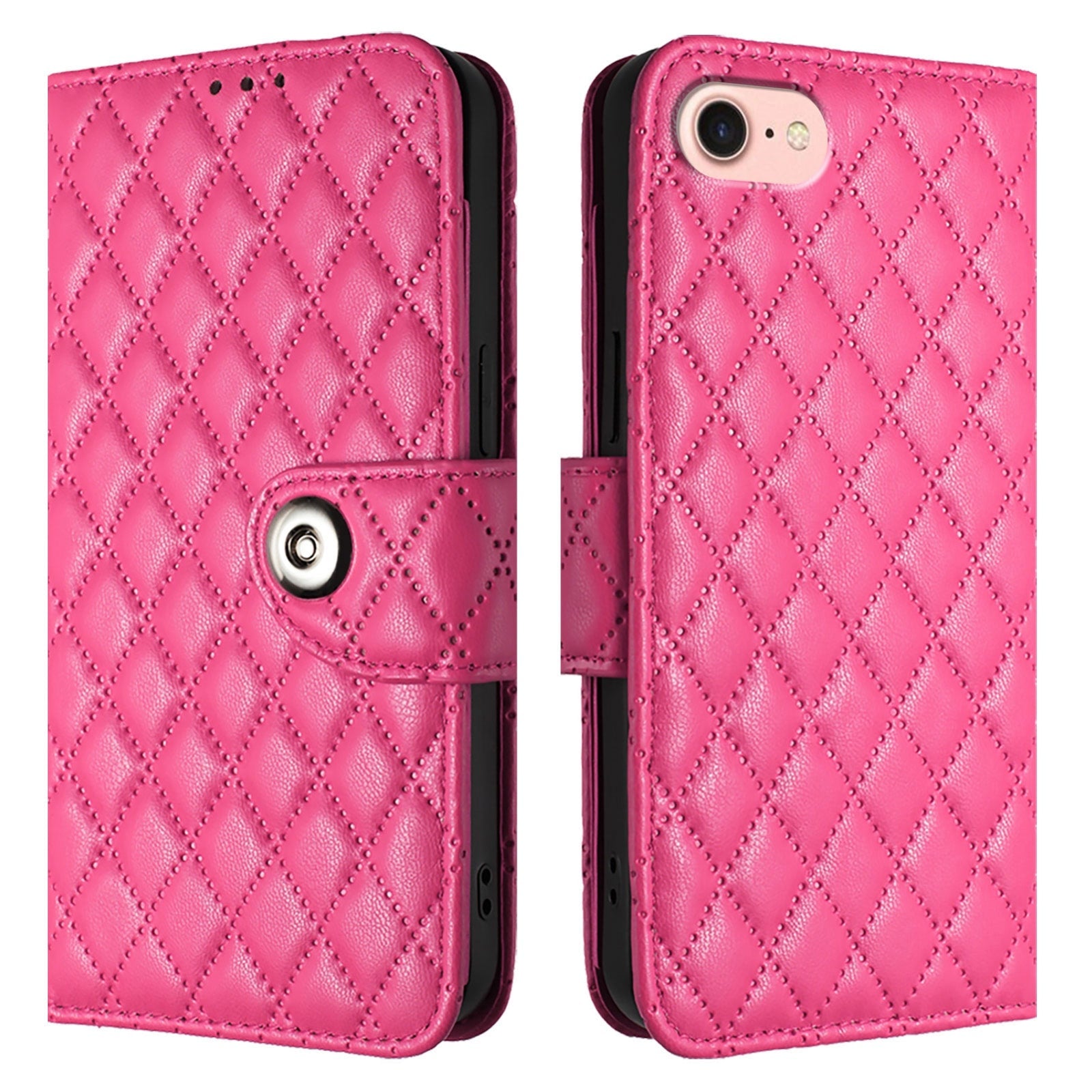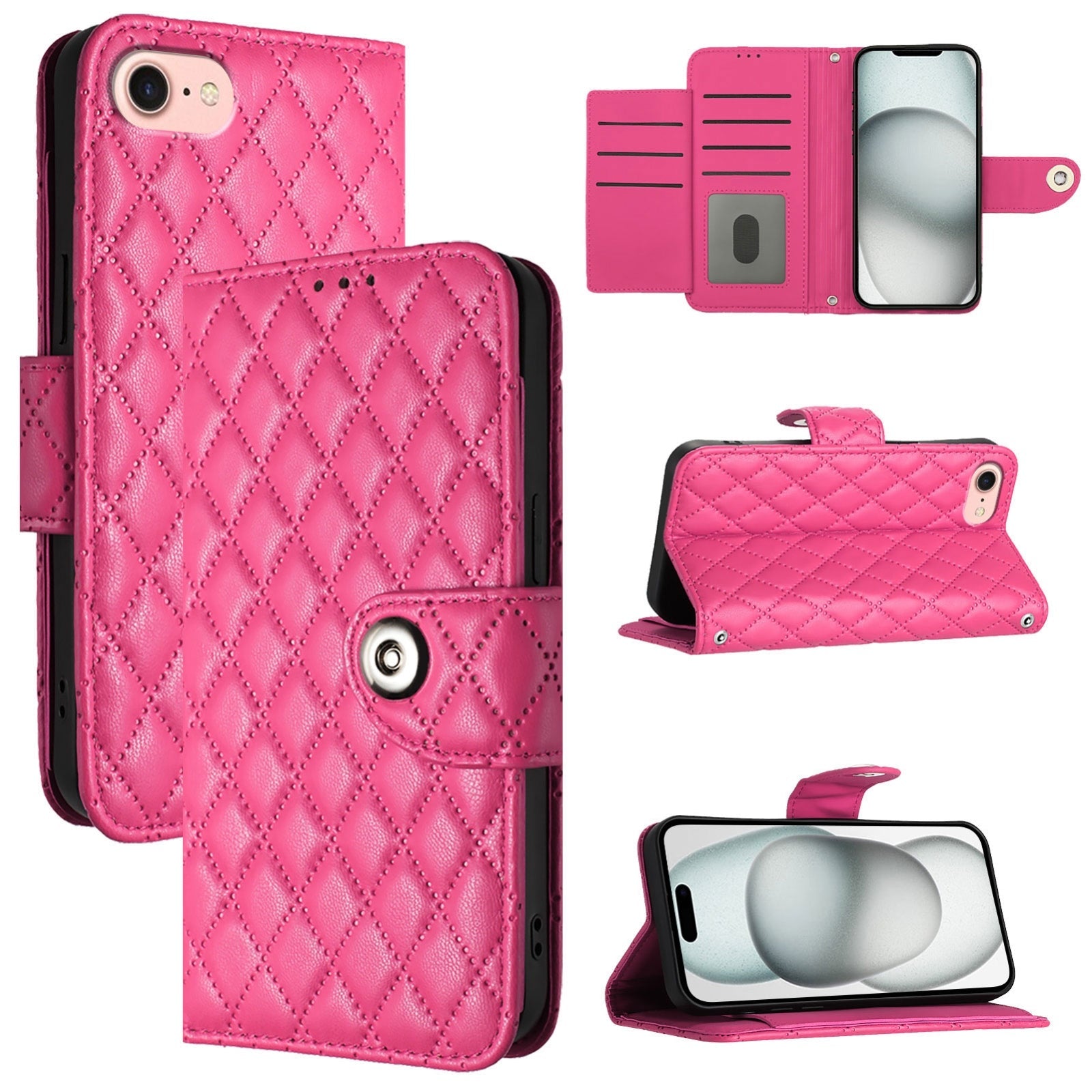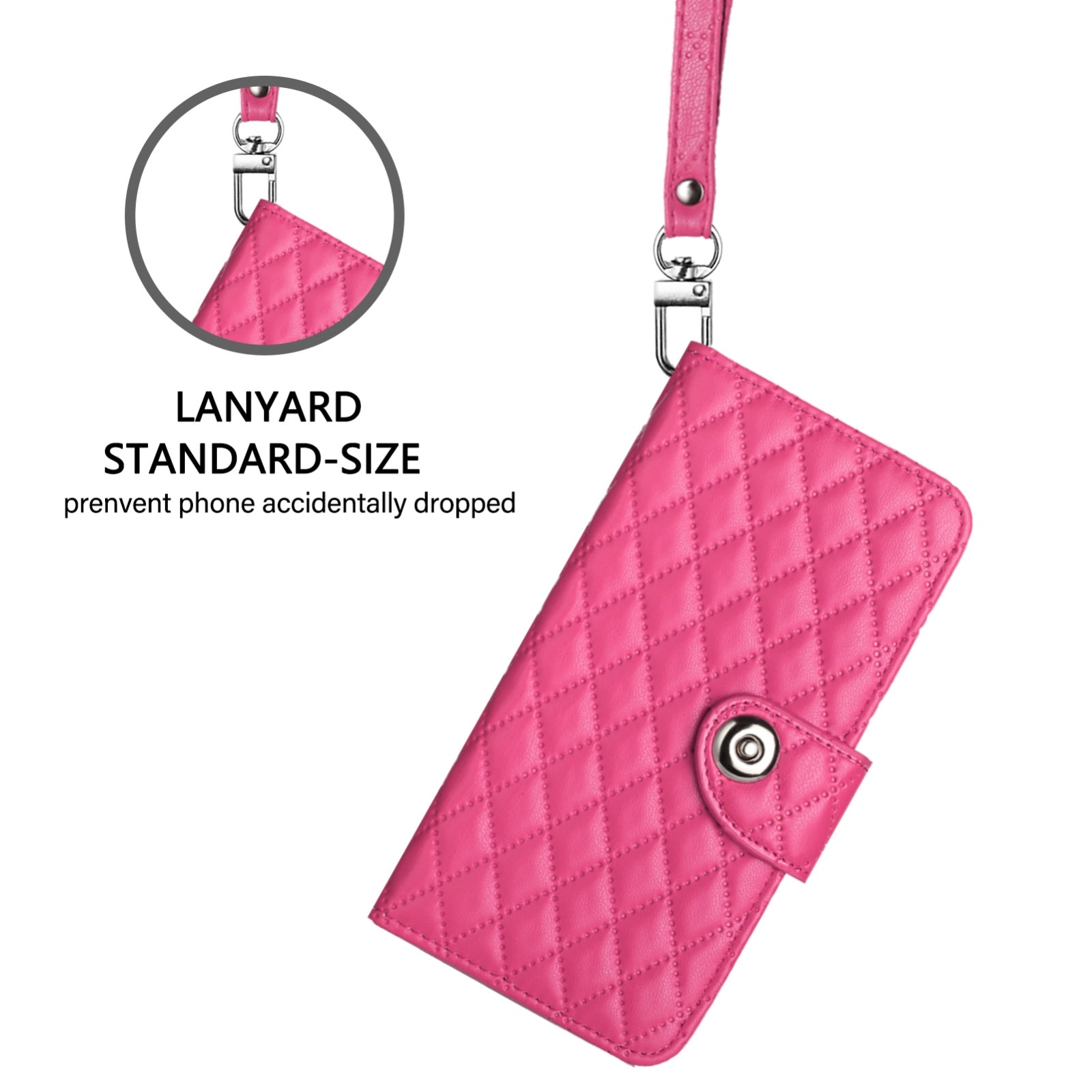For iPhone 16e Rhombic Texture Flip Leather Phone Case with Lanyard(Rose Red)
