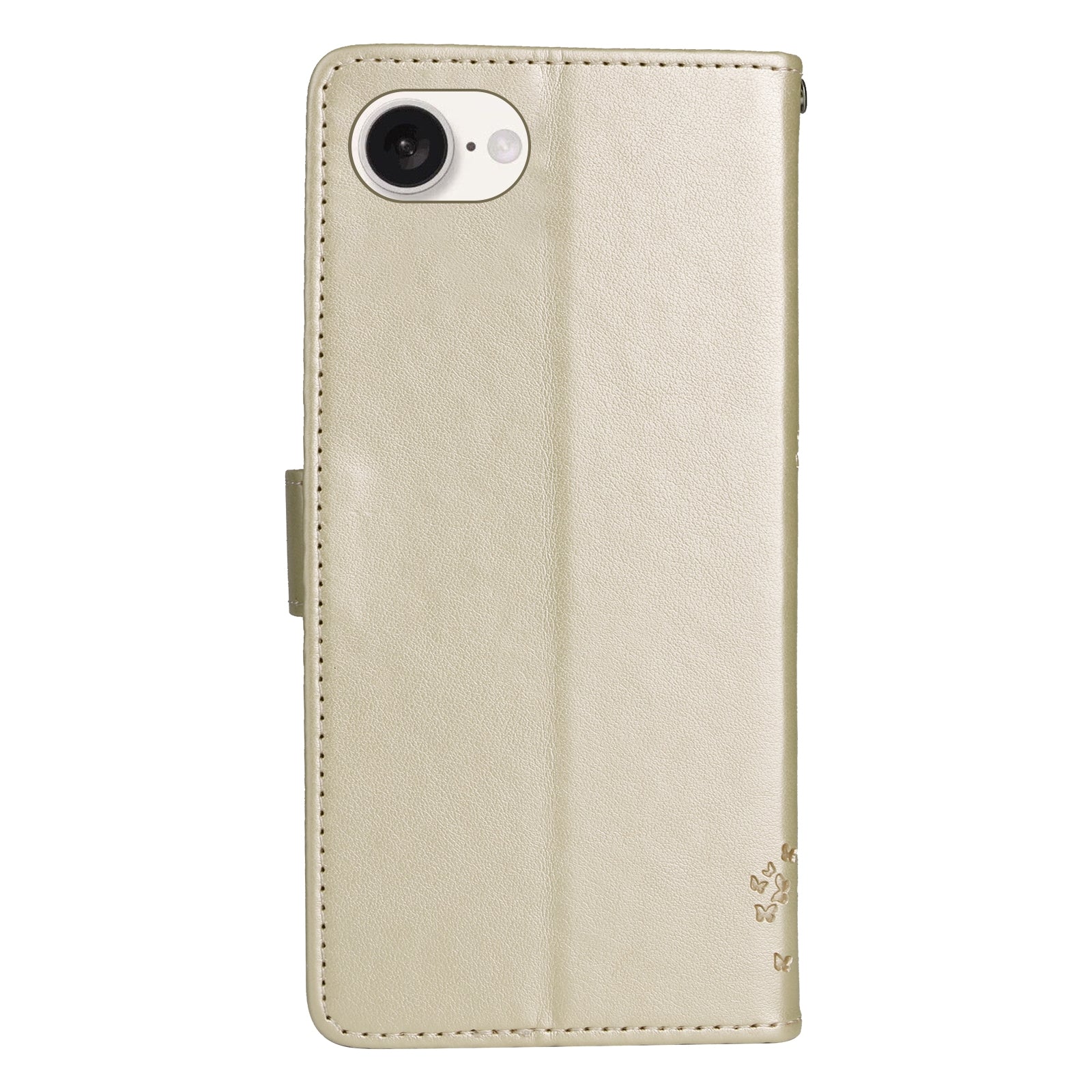 For iPhone 16e Tree & Cat Embossed Pattern Flip Leather Phone Case(Gold)