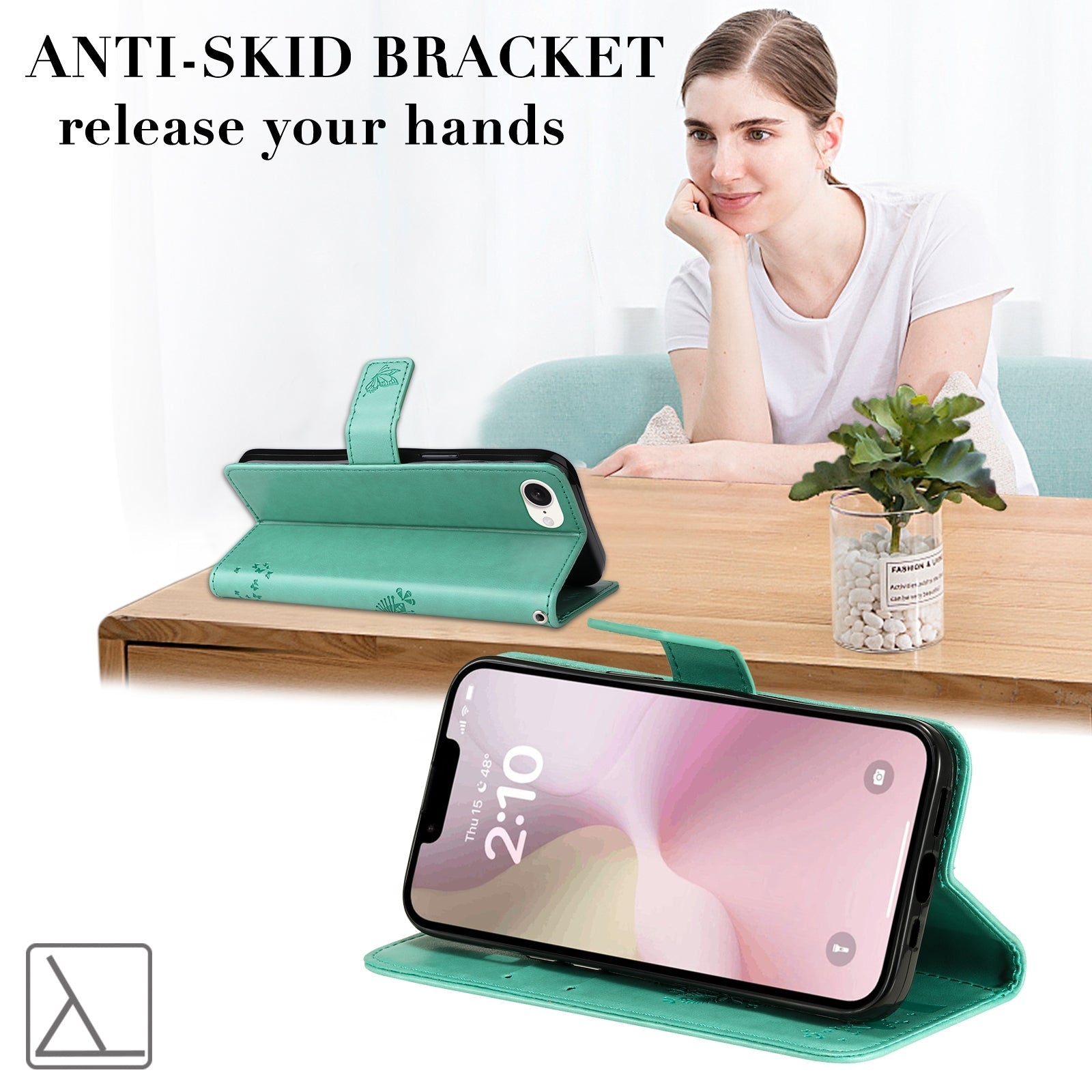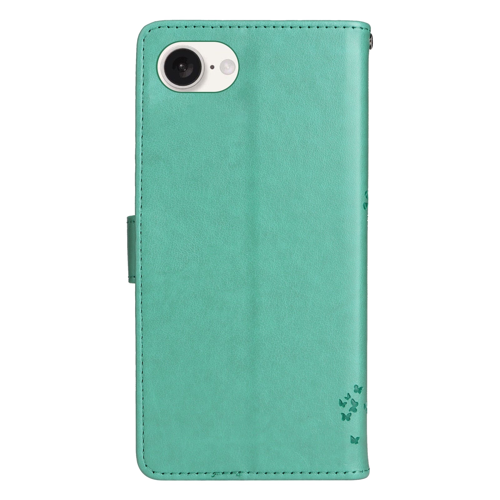For iPhone 16e Tree & Cat Embossed Pattern Flip Leather Phone Case(Green)
