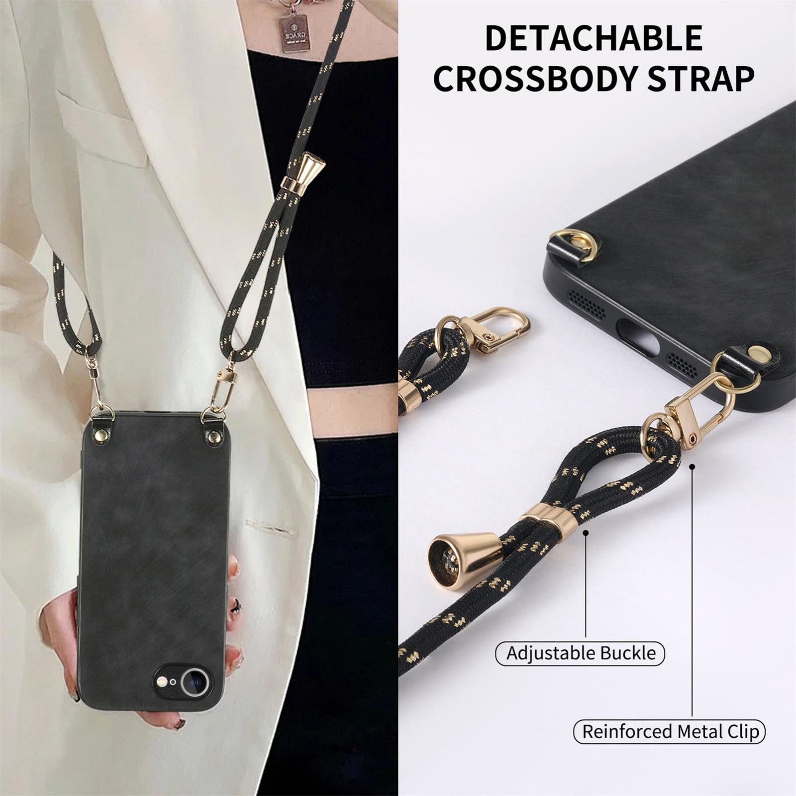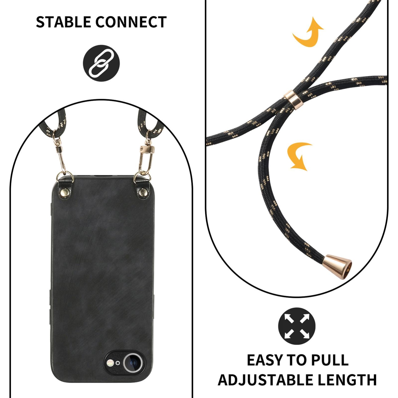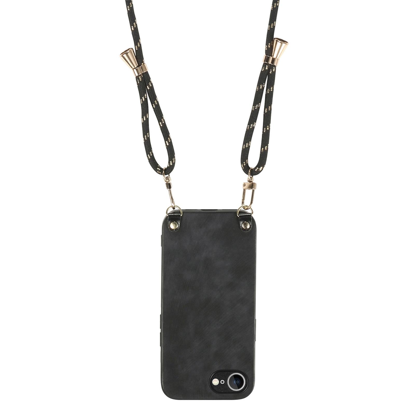 For  iPhone 16e Vintage Leather PC Back Cover Phone Case with Crossbody Strap(Black)
