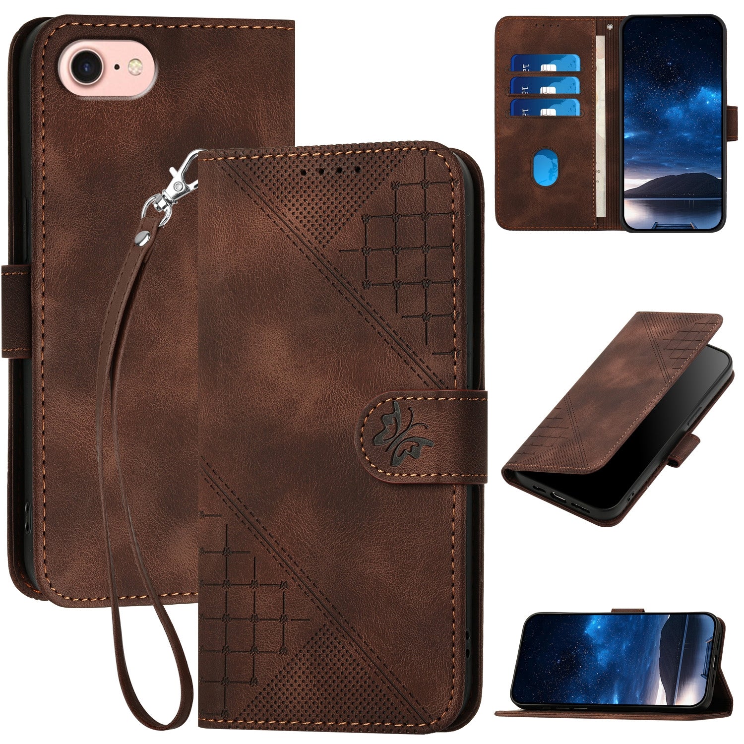 For iPhone 16e YX0080 Grid Butterfly Embossed Pattern Flip Leather Phone Case with Lanyard(Coffee)
