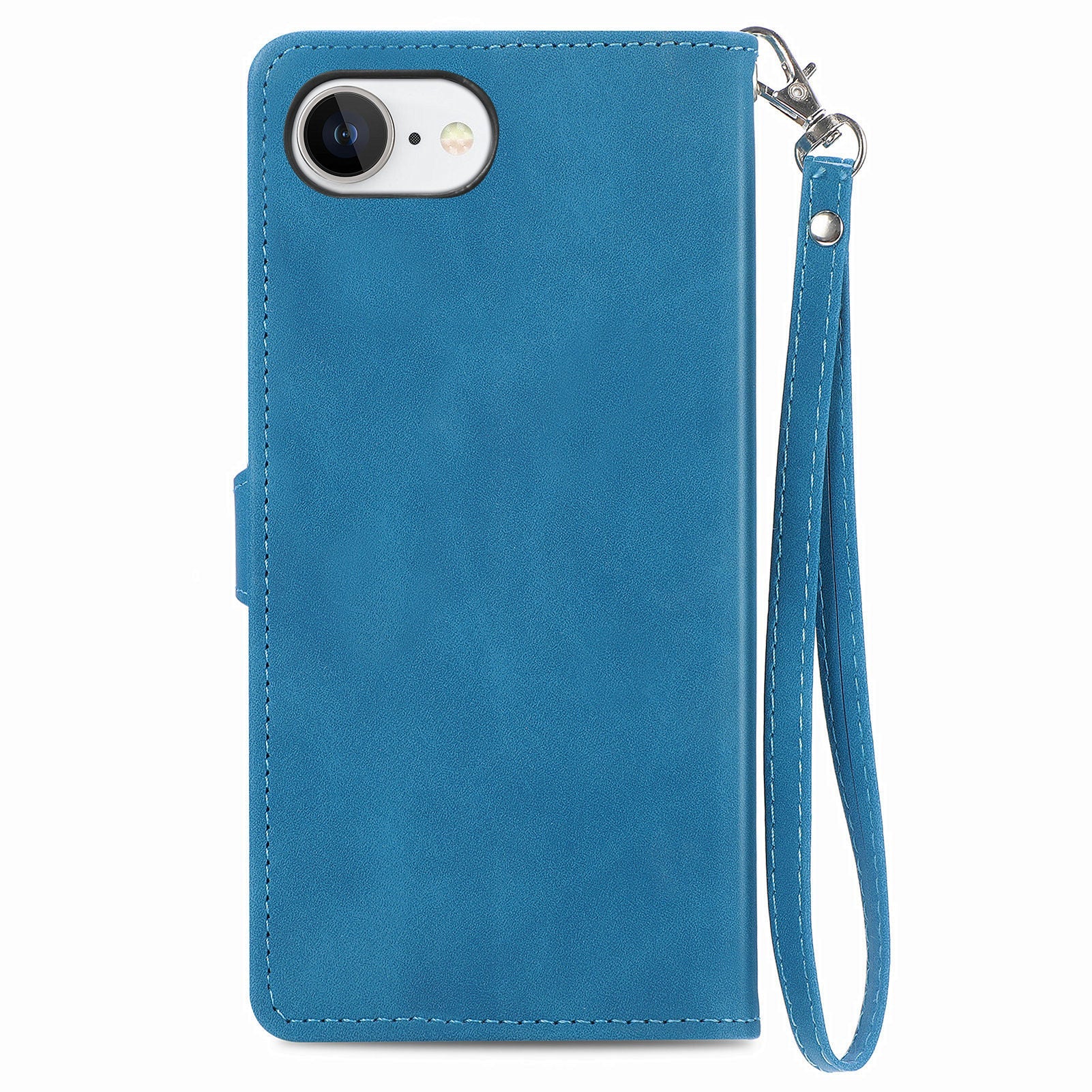 For iPhone 16e Zipper Wallet Case Flower Imprint PU Leather Phone Cover with Strap - Blue