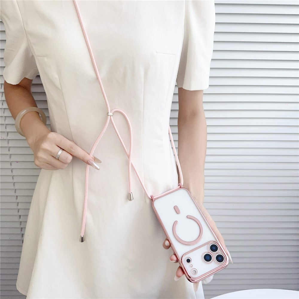 For iPhone 17 Pro Max Case Compatible with MagSafe Electroplating TPU Phone Cover with Long Lanyard - Rose Gold