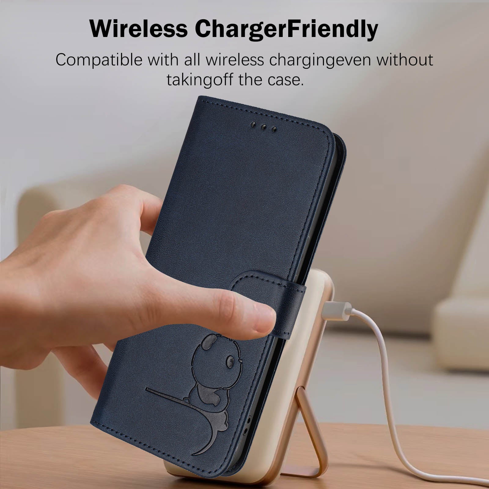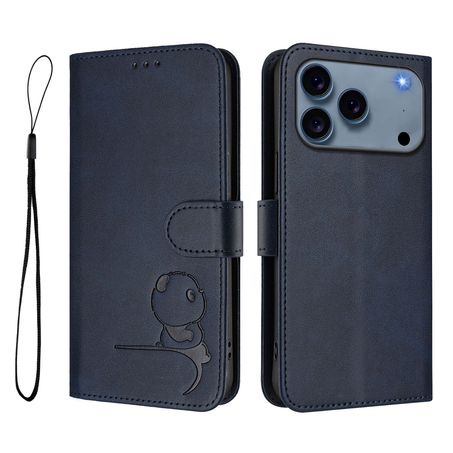 For iPhone 17 Pro Max Case Panda Imprint RFID Blocking Wallet Leather Phone Cover with Wrist Strap - Blue