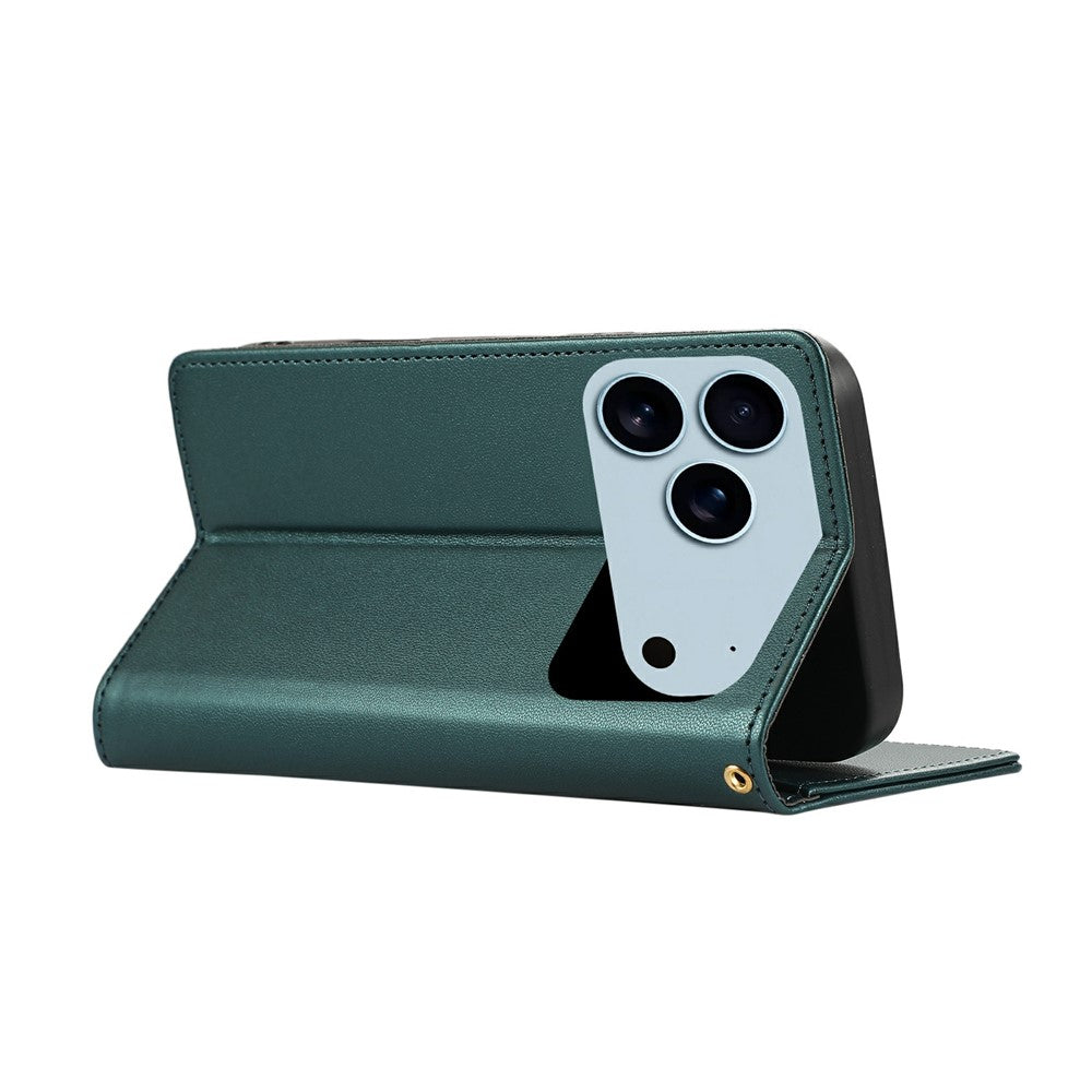 For iPhone 17 Pro Max Case RFID Blocking Wallet Stand Rhombus Leather Phone Cover with Wrist Strap - Green