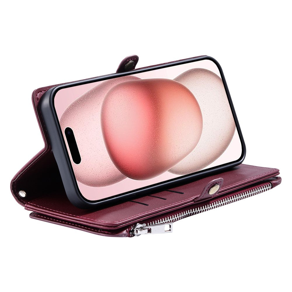 For iPhone 17 Pro Max Case TPU + PU Leather Wallet Phone Cover with Wrist Strap - Wine Red