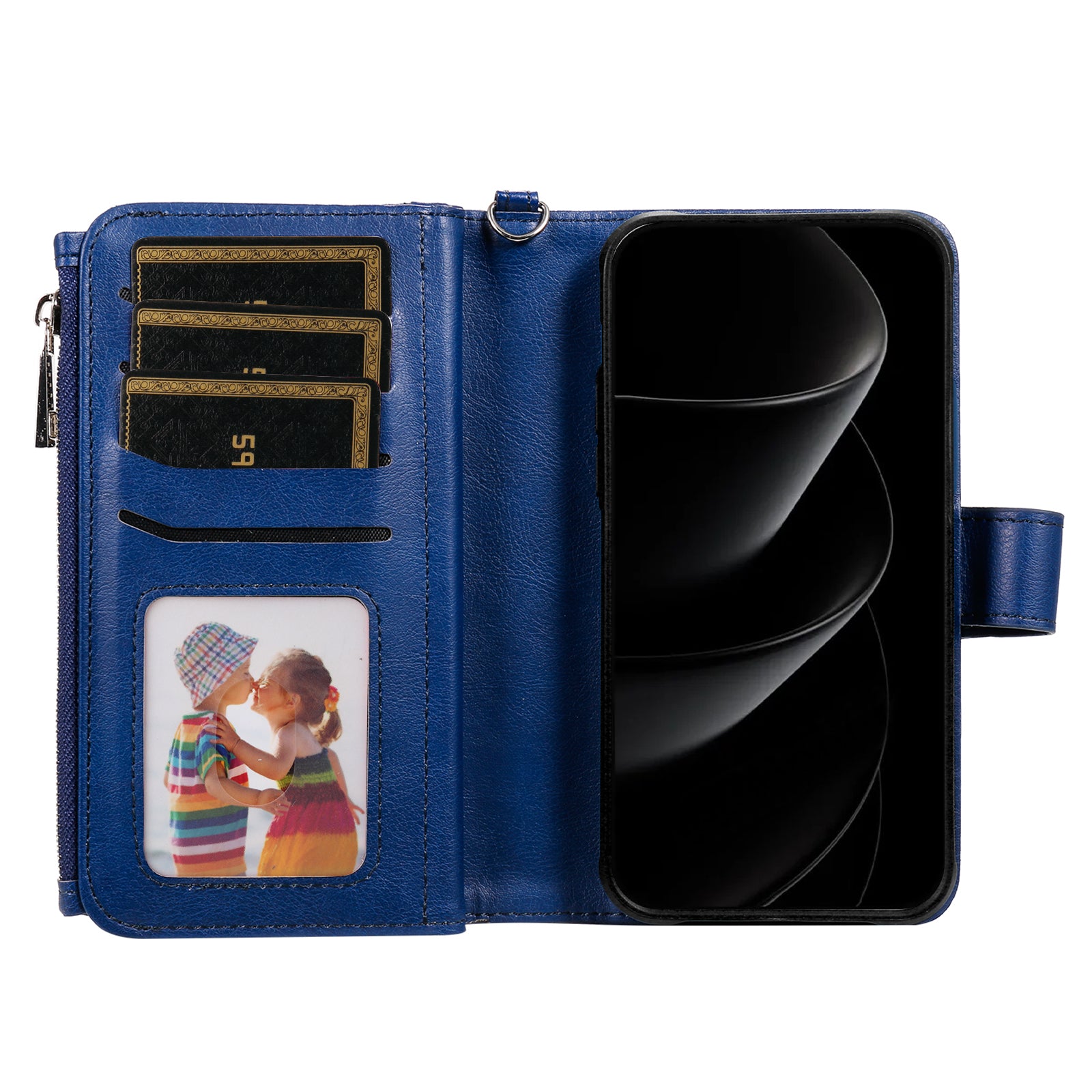 For iPhone 17 Pro Max Magnetic Leather Case Mobile Cover with Detachable Zipper Wallet Strap - Blue