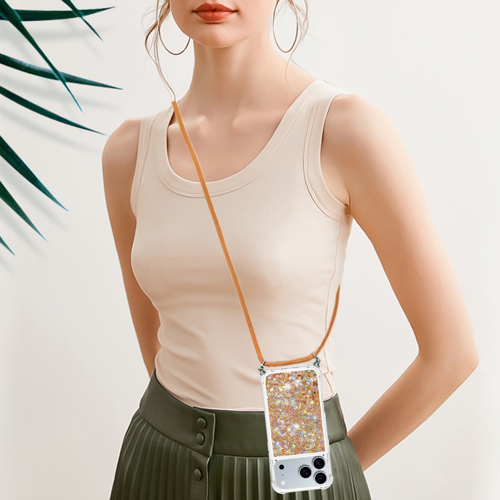 For iPhone 17 Pro Max TPU Case Quicksand Phone Cover with Lanyard - Gold / Hearts