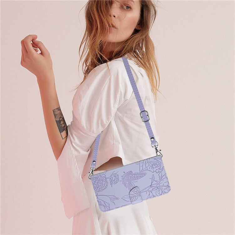 For Motorola Edge 30 Neo 5G Skin-touch PU Leather Stand Wallet Case Butterfly Flowers Imprinting Phone Cover with Shoulder Strap - Light Purple
