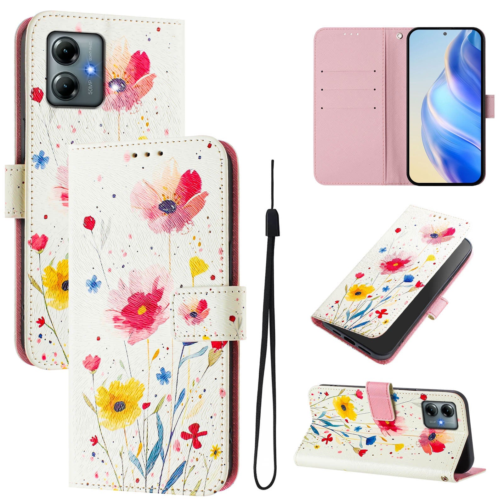 For Motorola Moto G Play (2025) 4G Case Pattern Printing Wallet Phone Cover with Strap - Flower