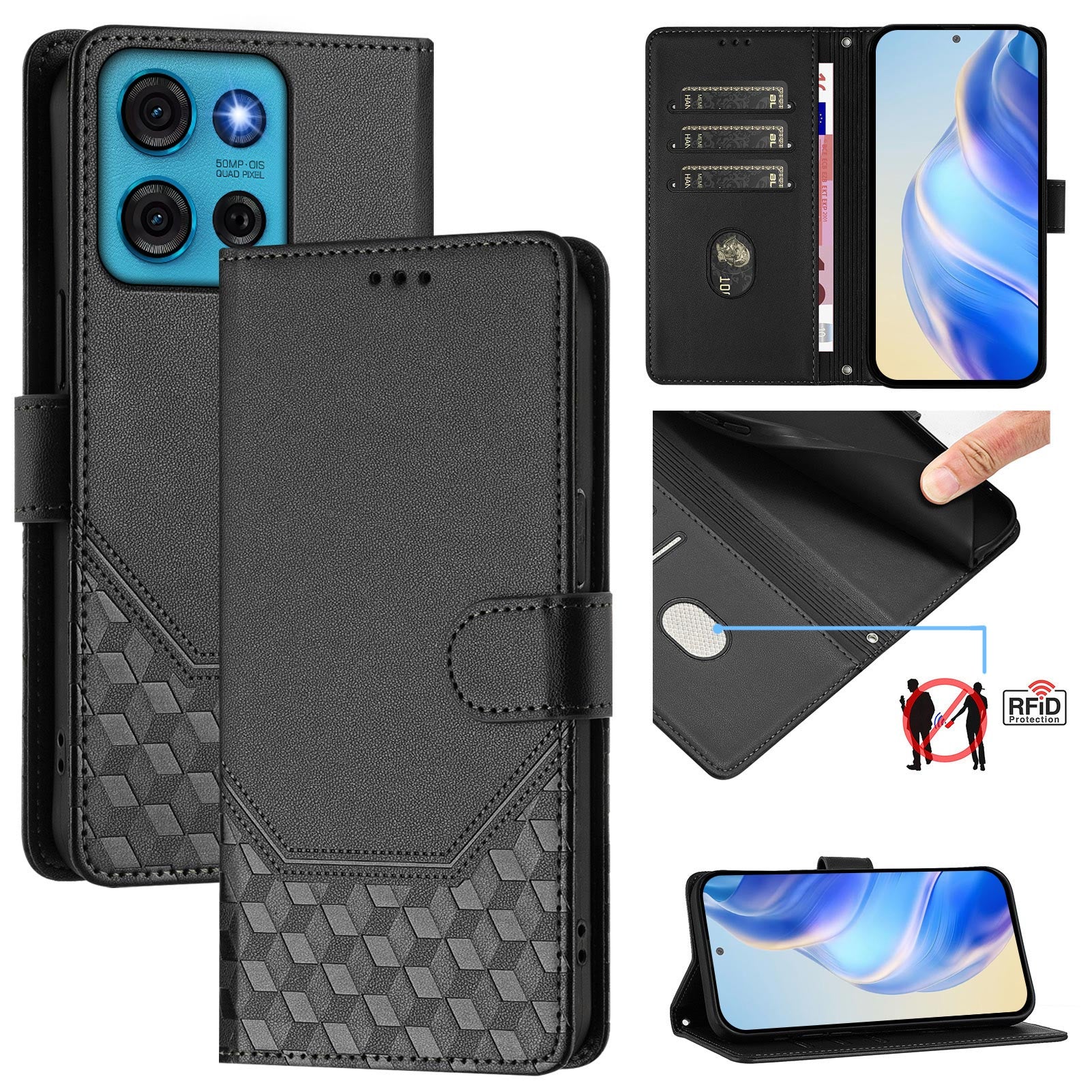For Motorola Moto G75 5G Case Imprinted Honeycomb RFID Blocking Leather Phone Cover with Strap - Black