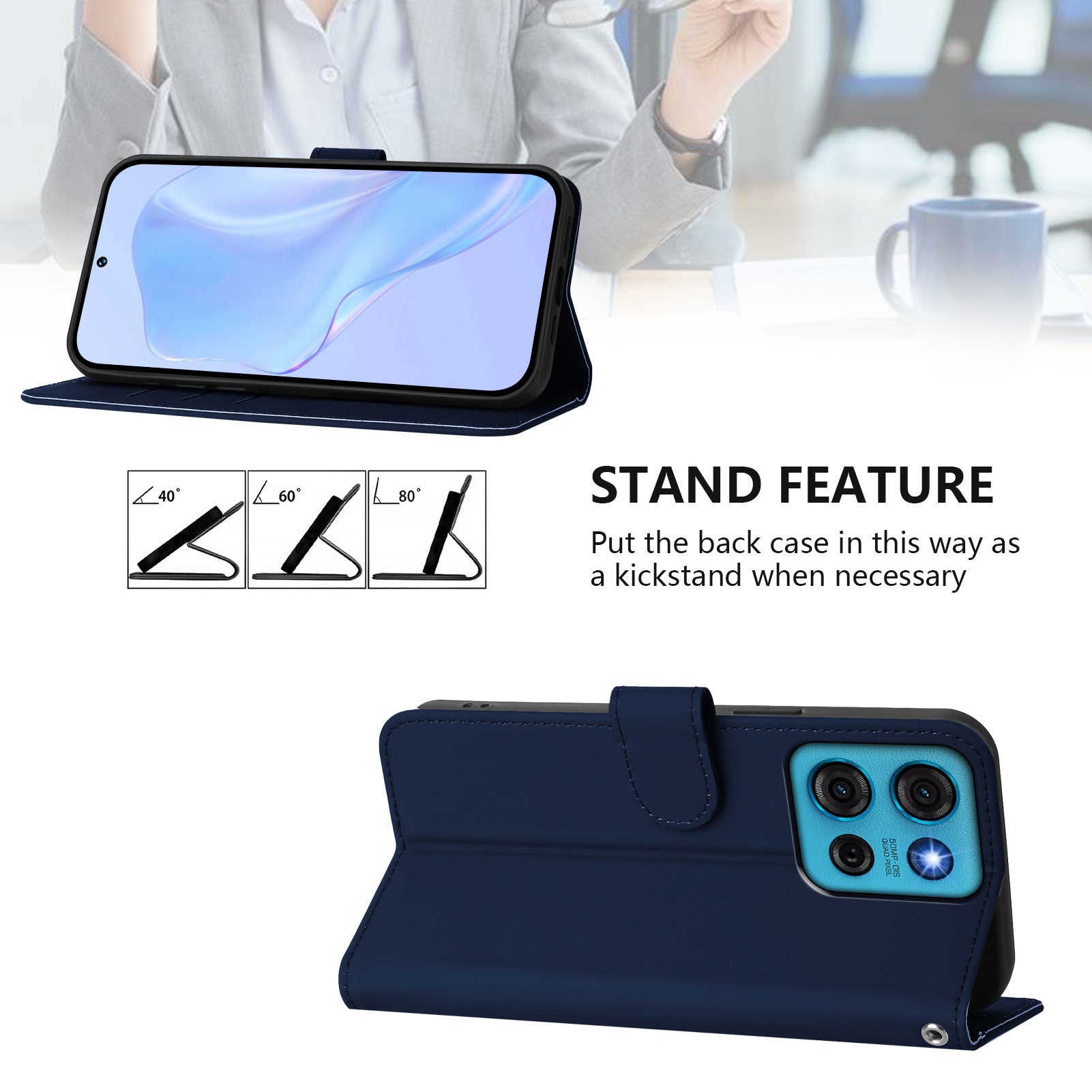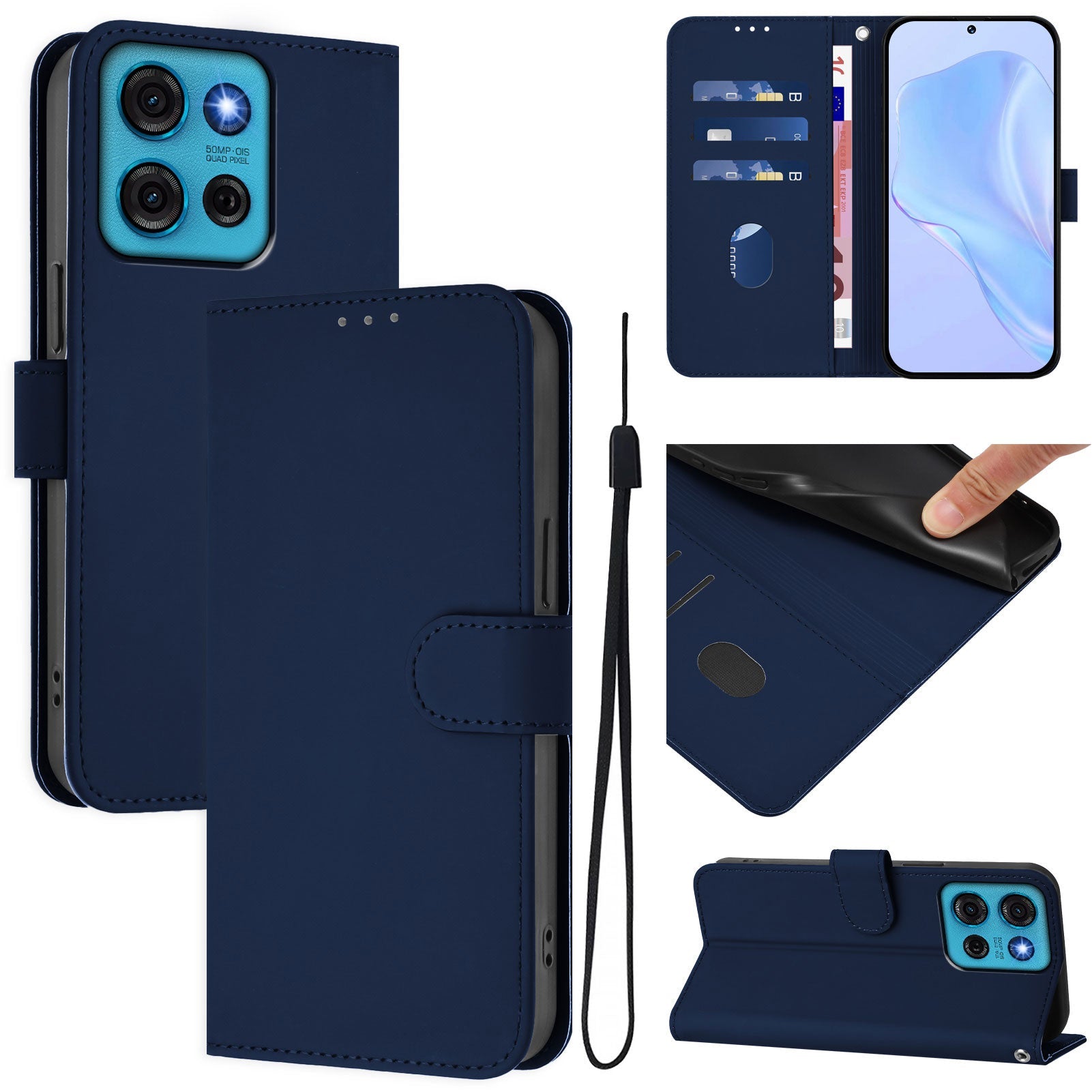 For Motorola Moto G75 5G Case Solid Color Wallet Leather Phone Cover with Strap - Navy Blue
