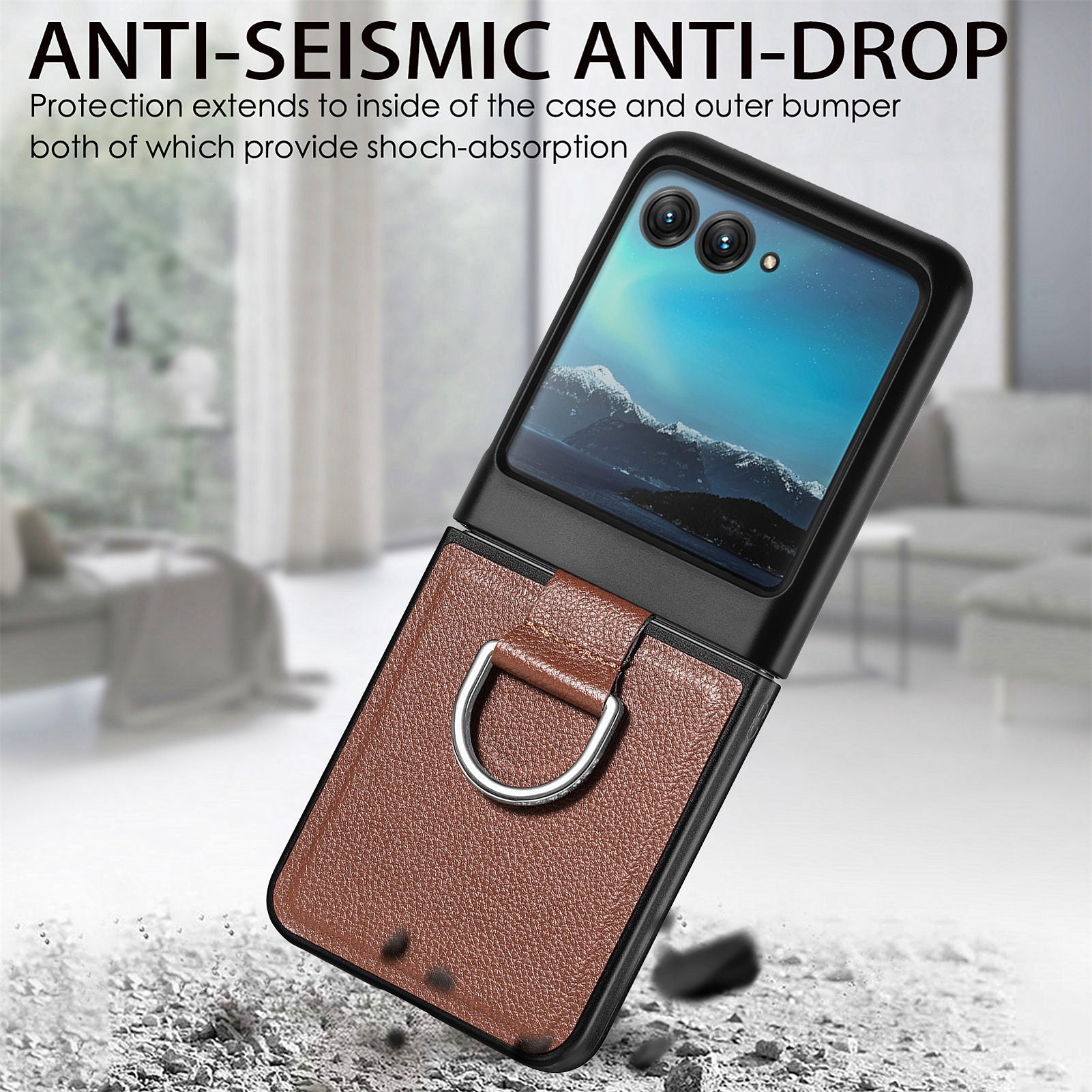 Uniqkart for Motorola Razr 40 Ultra 5G PU Leather Coated PC Phone Case Finger Ring Holder Litchi Texture Phone Cover - Brown