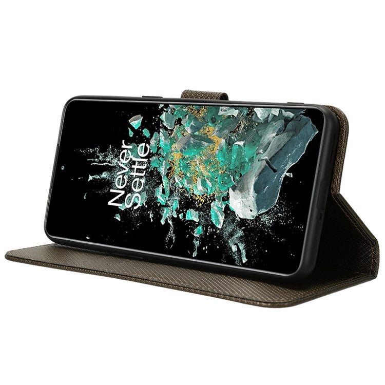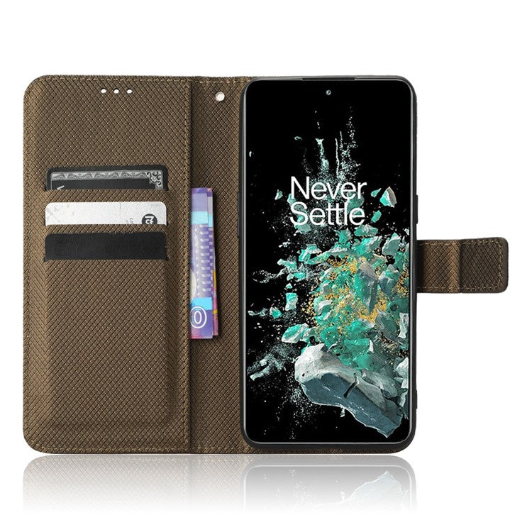 For OnePlus 10T 5G / Ace Pro 5G Diamond Texture Collision Resistant Phone Shell Magnetic Clasp PU Leather Stand Wallet Case with Wrist Strap - Brown