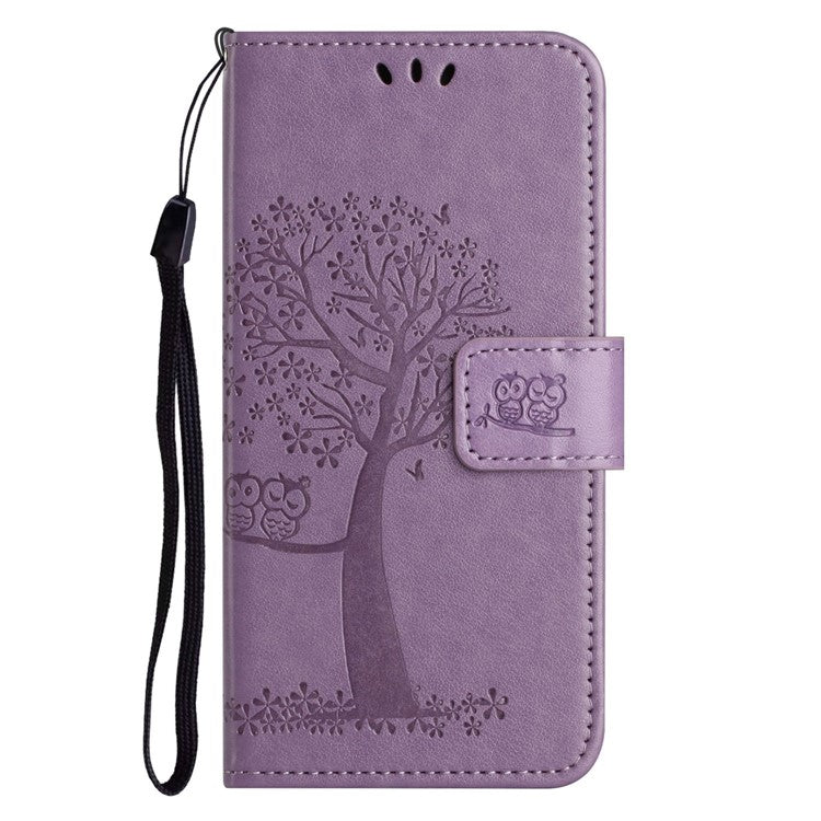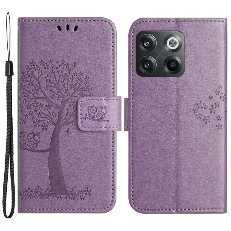 For OnePlus 10T 5G / Ace Pro 5G Drop-proof PU Leather Phone Case Imprinted Owl Tree Pattern Wallet Stand Protective Shell with Wrist Strap - Purple